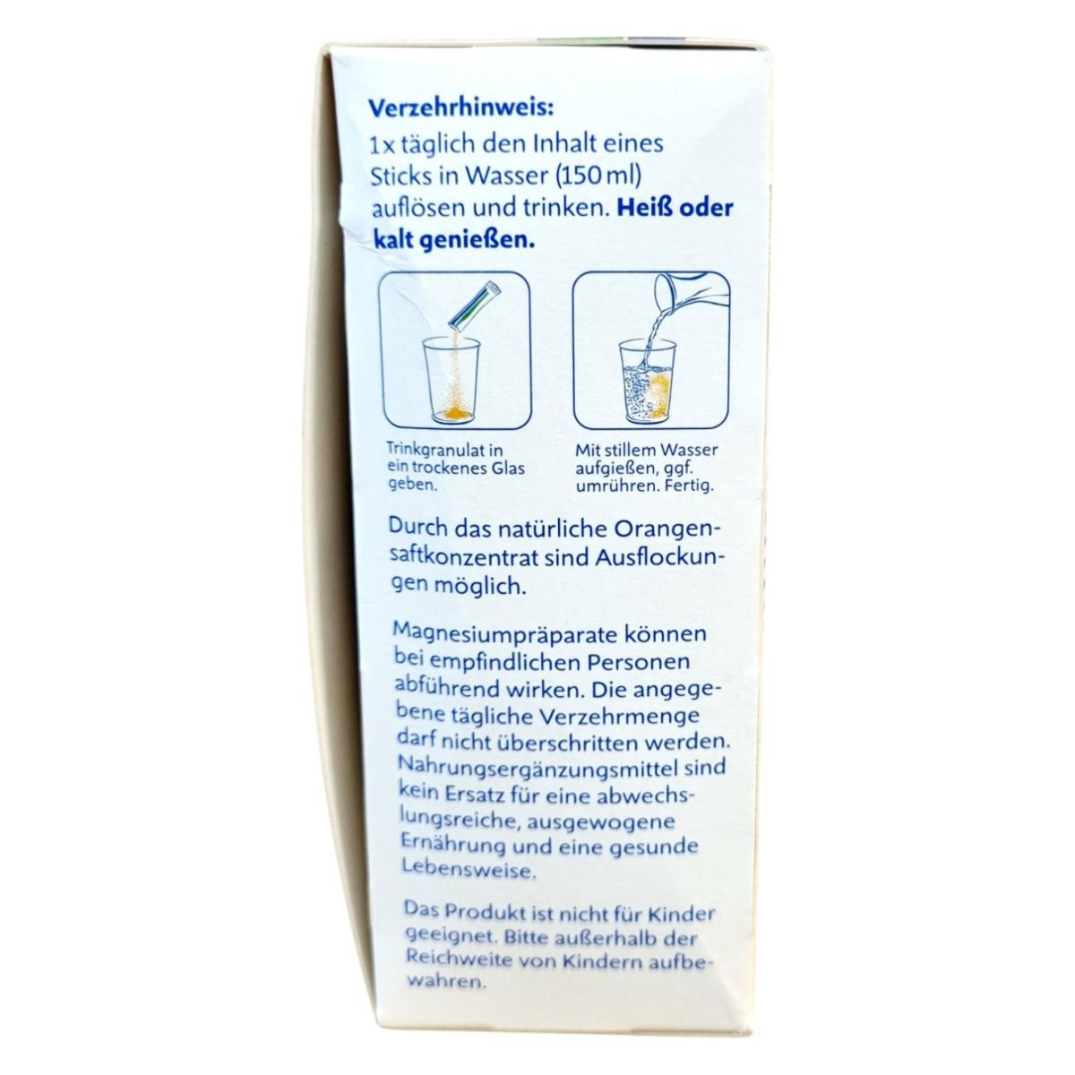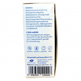 Magnézium-citrát, narancsgyümölcs por (maltodextrin, narancslé sűrítmény 4,5%), savanyúságot szabályozó: citromsav, kálium-hidrogén-karbonát, édesítőszer: szukralóz, színezék: riboflavin és céklavörös.