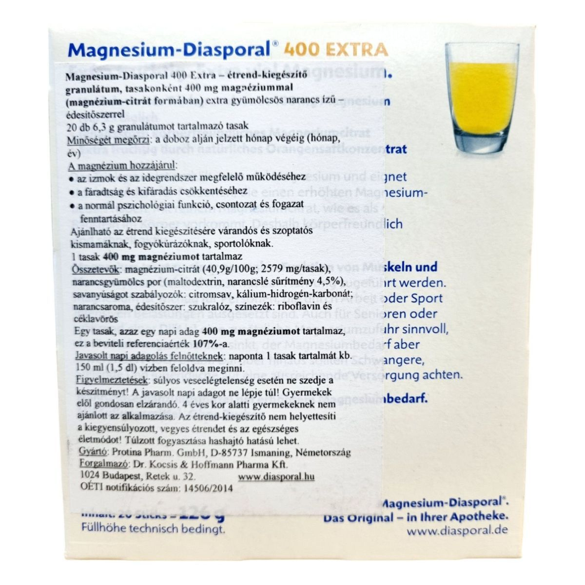 A Magnesium Diasporal 400 EXTRA egy étrend-kiegészítő, amely tasakonként 400 mg magnéziumot tartalmaz magnézium-citrát formában. Az extra gyümölcsös narancs ízű granulátum hozzájárulhat az izmok és az idegrendszer megfelelő működéséhez, valamint a fáradtság és kimerültség csökkentéséhez.