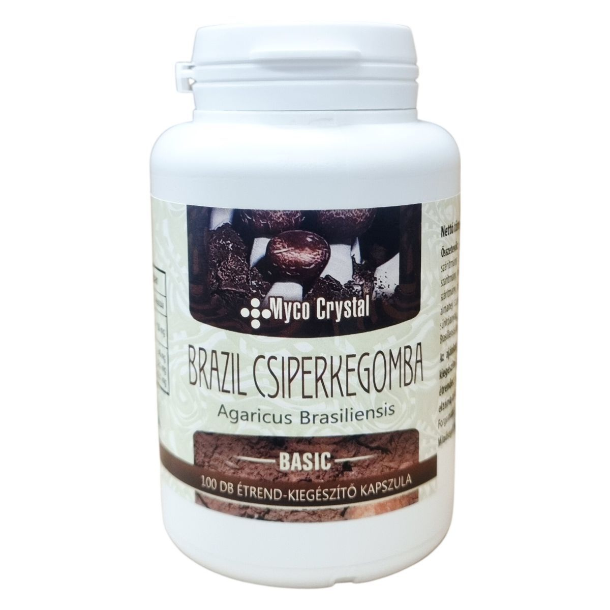 A Myco Crystal Basic brazil csiperkegomba (Agaricus Brasiliensis) étrend-kiegészítő kapszula 100 darabos kiszerelésű termék, nettó tömege 62 g (100 db x 620 mg). A készítmény fő hatóanyagát a brazil csiperkegomba kivonata adja, mely 1:10 arányban koncentrált. Kiegészítésként Flavin 7 bioflavonoid komplexet tartalmaz, amely különböző gyümölcskivonatokat foglal magában, mint például vörös szőlő, feketeszeder, feketecseresznye és más bogyós gyümölcsök maghéja és héja. A kapszula HPMC (hipromellóz) alapú, cink-oxiddal, sűrítőanyaggal és emulgeálószerrel. A termék a napi három kapszula bevételével alkalmazható, ajánlott bő vízzel lenyelni. A kapszulák rendszeres fogyasztása hozzájárulhat az egészséges életmód fenntartásához, azonban nem helyettesíti a változatos, kiegyensúlyozott étrendet.
