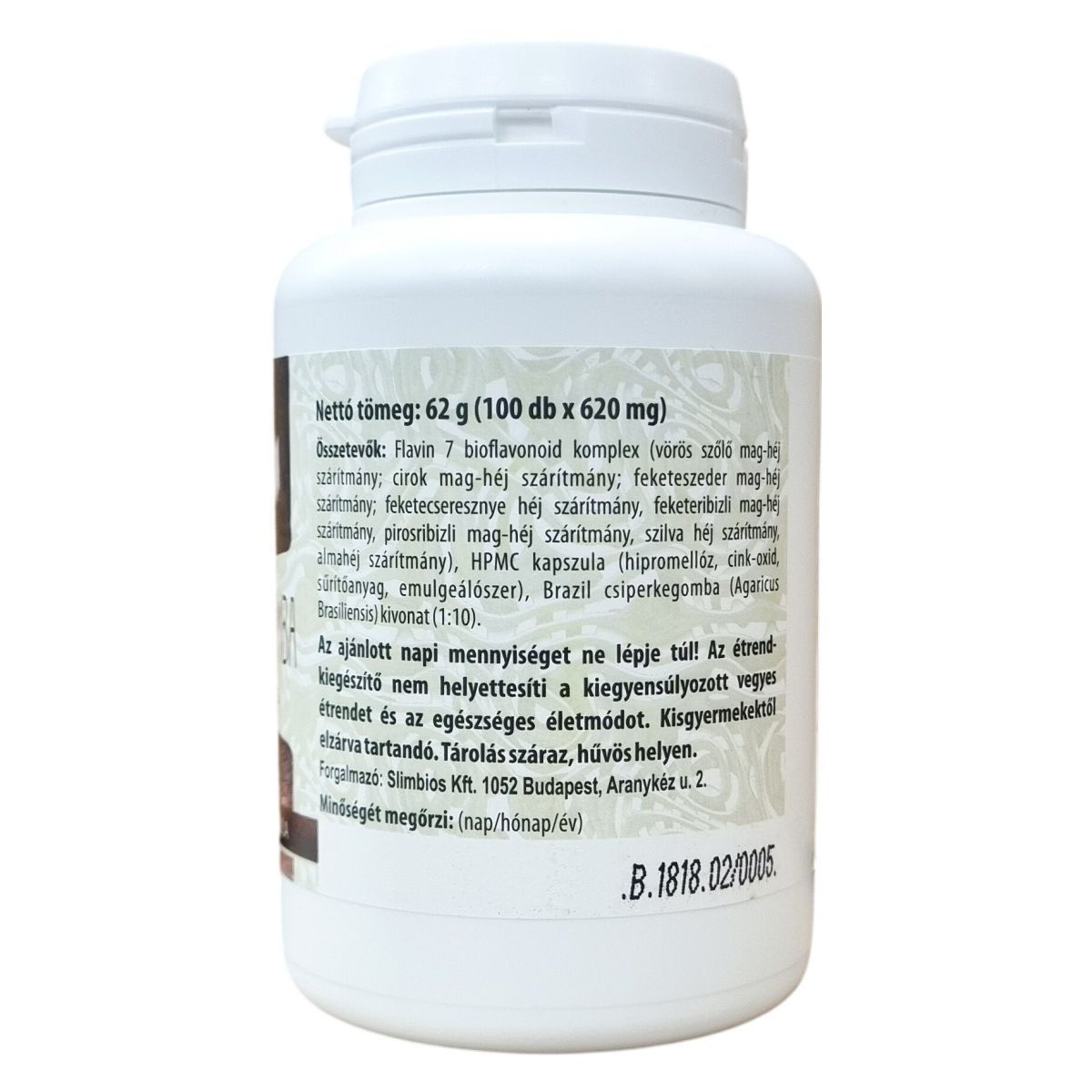 Flavin 7 bioflavonoid komplex (vörös szőlő mag-héj szárítmány; cirok mag-héj szárítmány; feketeszeder mag-héj szárítmány; feketecseresznye héj szárítmány; feketeribizli mag-héj szárítmány; pirosribizli mag-héj szárítmány; szilva héj szárítmány; almahéj szárítmány), HPMC kapszula (hipromellóz, cink-oxid, sűrítőanyag, emulgeálószer), Brazil csiperkegomba (Agaricus Brasiliensis) kivonat (1:10)