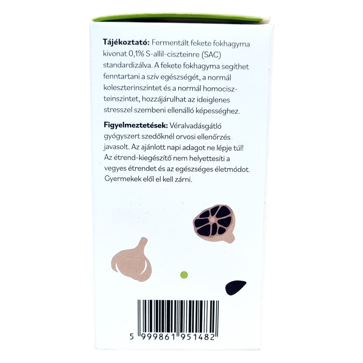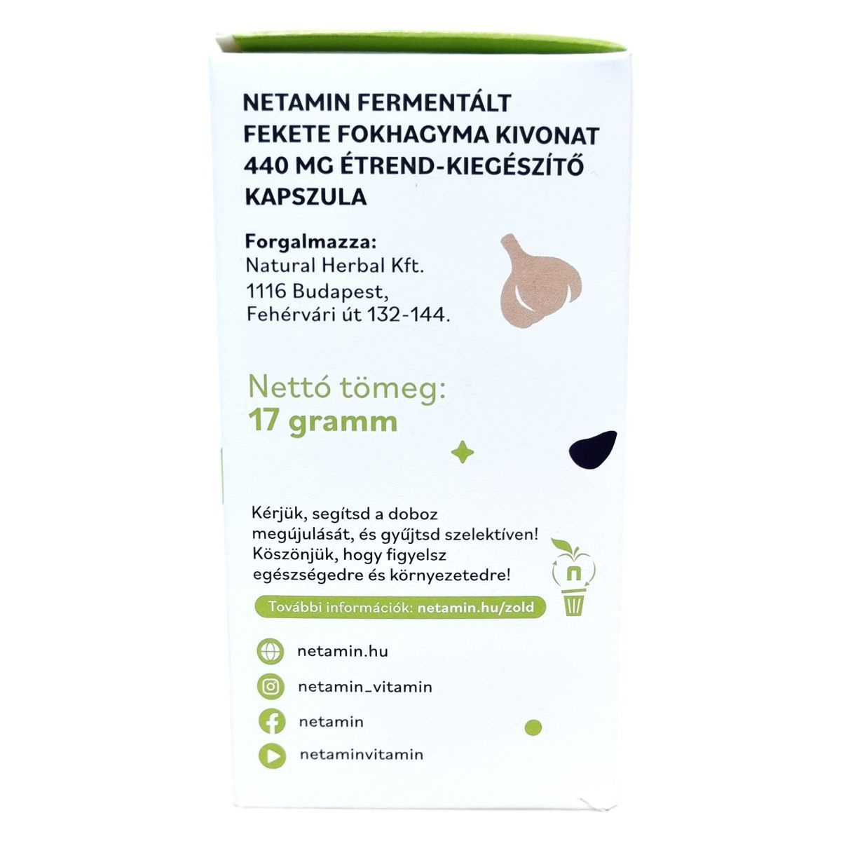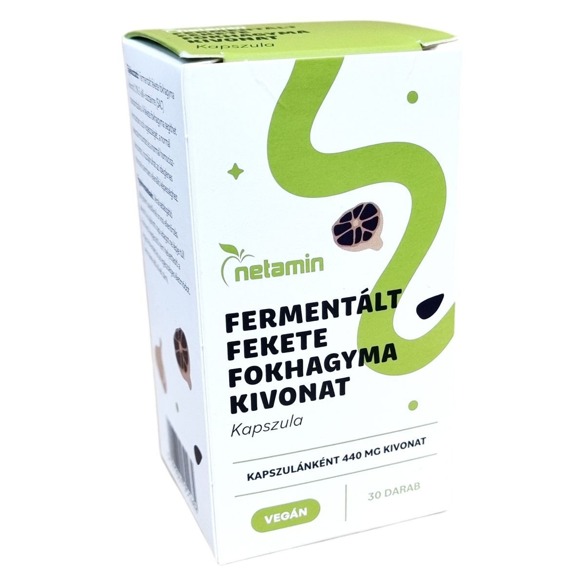 A Netamin fermentált fekete fokhagyma kivonat 440 mg hatóanyagot tartalmaz kapszulánként, melyből S-allil-cisztein 0,1% (440 µg) standardizált mennyiségben található meg. Ez az összetevő hozzájárulhat többek között a szív egészségének fenntartásához, a normál koleszterin- és homociszteinszint szabályozásához, valamint az ideiglenes stresszel szembeni ellenálló képességhez. A készítmény növényi kapszulahéjat alkalmaz, mely hidroxipropil-metilcellulózból készül, emellett rizslisztet és csomósodást gátló anyagot (zsírsavak magnéziumsói) tartalmaz. A termék vegán étrendbe is beilleszthető. Felhívjuk a figyelmet arra, hogy véralvadásgátló gyógyszert szedők számára orvosi ellenőrzés javasolt a használat során, továbbá az ajánlott napi adag túllépése nem ajánlott. A terméket gyermekek elől védeni kell, és nem helyettesíti a változatos étrendet vagy az egészséges életmódot. A doboz jelzi a fenntarthatóságot, kérve a szelektív hulladékgyűjtést a környezetvédelem érdekében.