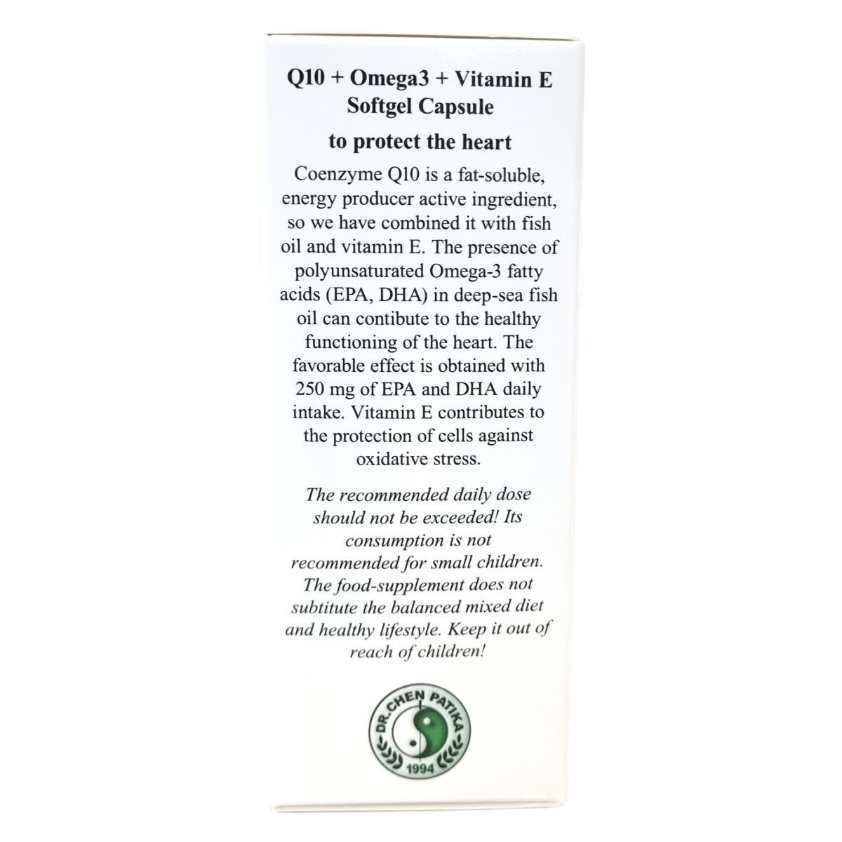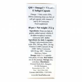 A Q10-koenzim egy zsírban oldódó, energiatermelő hatóanyag, amelyet halolajjal és E-vitaminnal kombináltak. A mélytengeri halolajban található EPA és DHA zsírsavak hozzájárulhatnak a szív egészséges működéséhez, és a kedvező hatás napi 250 mg EPA és DHA bevitelével érhető el. Az E-vitamin segítheti a sejtek védelmét az oxidatív stresszel szemben. A termék 680 mg-os lágyzselatin kapszula formájában, 40 darabos kiszerelésben érhető el. Származási helye Kína.