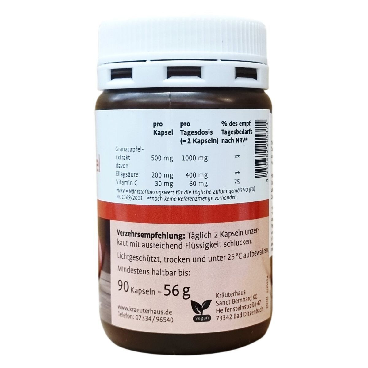 Gránátalma-kivonatot és C-vitamint tartalmazó étrend-kiegészítő. Egy kapszula 500 mg gránátalma-kivonatot tartalmaz, amelyből 200 mg ellagsav, valamint 30 mg C-vitamin. A C-vitamin hozzájárul a napi referenciaérték 75%-ához 2 kapszula esetén. A tápanyag-referenciaérték az 1169/2011/EU rendelet alapján került meghatározásra. 90 kapszulát tartalmazó kiszerelés. Származási hely: Németország.