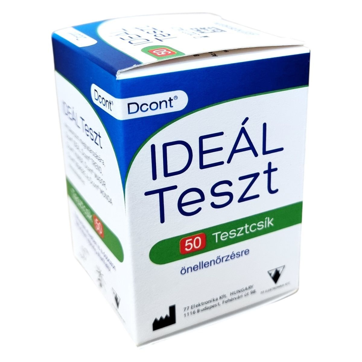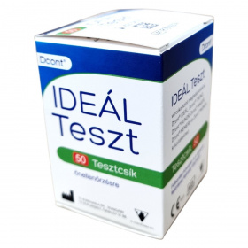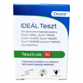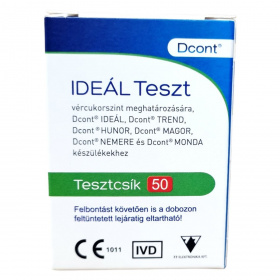 A Dcont IDEÁL Teszt vércukorszint meghatározására szolgáló tesztcsík önellenőrzésre, Dcont IDEÁL, TREND, HUNOR, MAGOR, NEMERE és MONDA készülékekhez.
