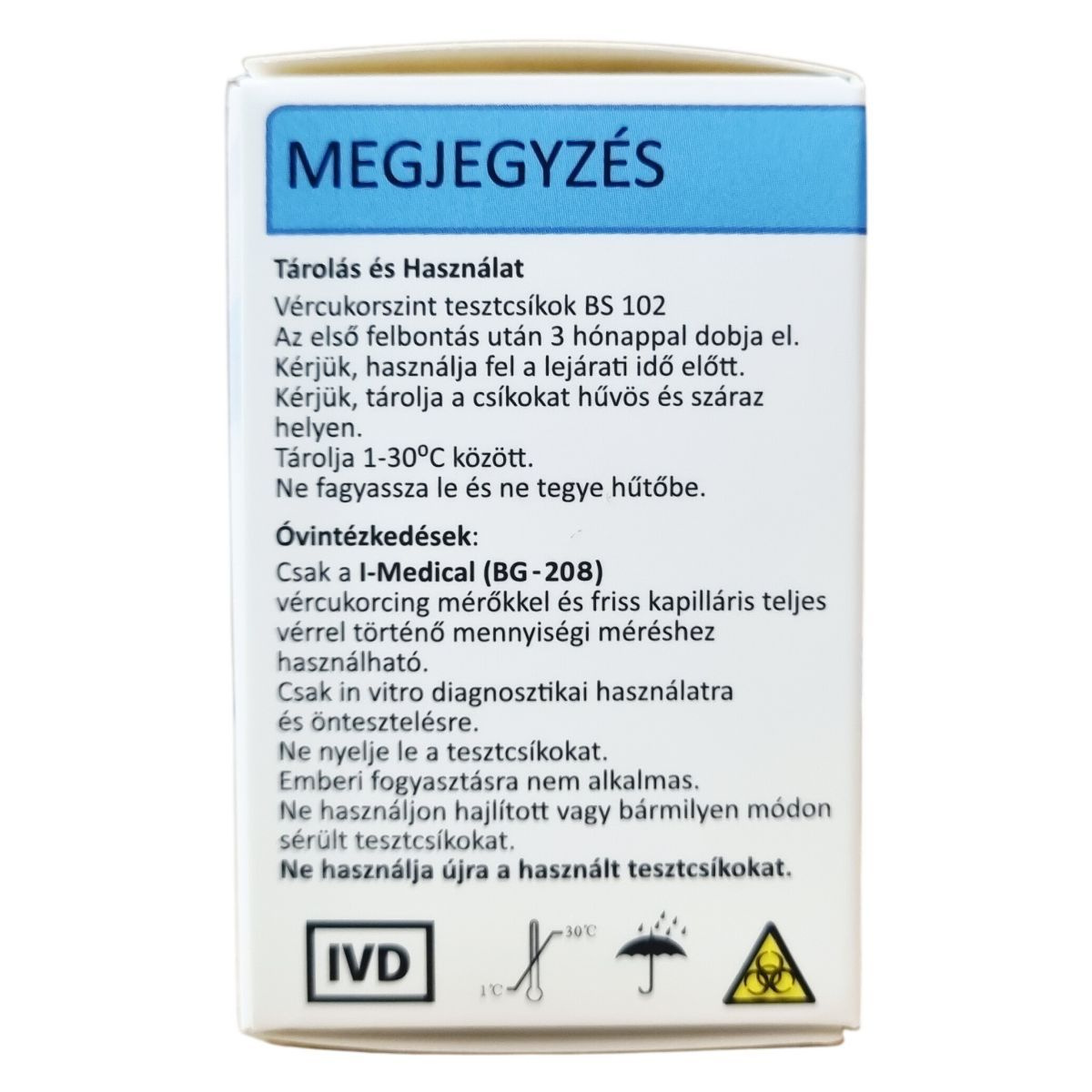 Ne nyelje le a tesztcsíkokat, emberi fogyasztásra nem alkalmasak. Csak az I-Medical BG-208 mérőkkel használhatóak. Csak in vitro diagnosztikai és öntesztelési célra. Ne használjon sérült vagy újrahasznált tesztcsíkokat.