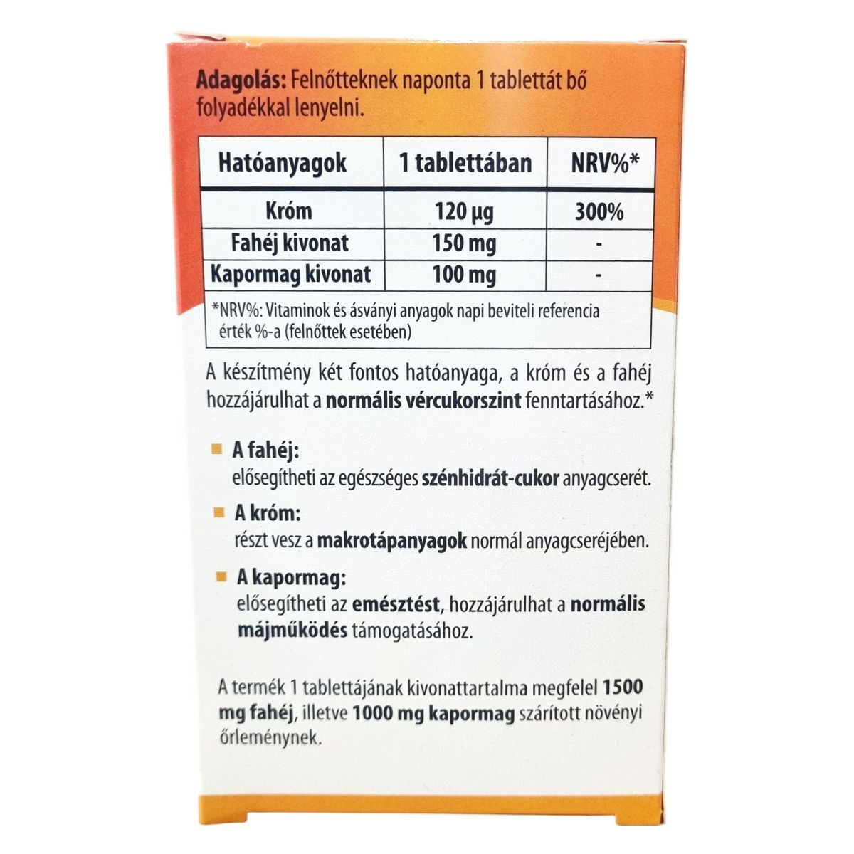 A termék 1 tablettájának kivonattartalma megfelel 1500 mg fahéj, illetve 1000 mg kapormag szárított növényi őrleménynek.