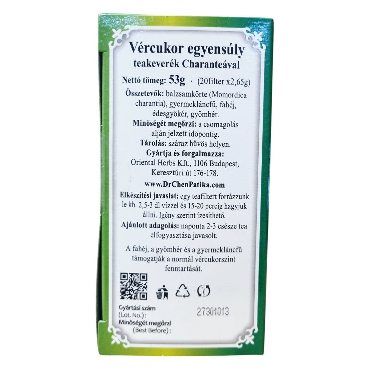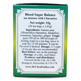 A vércukor egyensúly teakeverék hatékonyan egyesíti a balzsamkörte (Momordica charantia), gyermekláncfű, fahéj, édesgyökér és gyömbér természetes előnyeit. A fahéj, a gyömbér és a gyermekláncfű támogatják a normál vércukorszint fenntartását. A termék több mint 30 éve fogyasztók bizalmát élvezi a Dr. Chen Patika minőségi gyártási gyakorlatával, amely biztosítja a megbízható és ellenőrzött termék előállítását. A teakeverék 20 darab filterből áll, melyek aromazáró csomagolásban vannak, így megőrzik frissességüket és hatóanyagaikat.