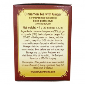 A fahéj és a gyömbér hagyományos kínai orvoslás elvei alapján összeállított formula, melyet számos kutatás igazolt hatékonysággal az egészséges vércukorszint fenntartásában. Továbbá a légutak egészségét is támogatja. A gyömbér elősegíti az emésztőrendszer, az immunrendszer és a szív egészségét. A cékla jelentős mennyiségű sötétvörös flavonoid színanyagot tartalmaz, amelyek antioxidáns tulajdonságúak. A termék aromazáró csomagolásban kerül forgalomba, így megőrzi frissességét. A javasolt adag naponta két csésze tea fogyasztása.