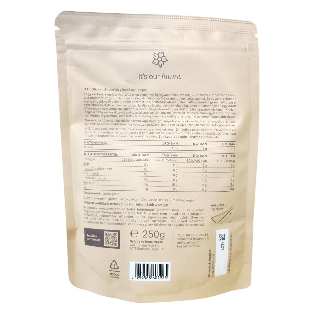 A GAL Glicin étrend-kiegészítő por naponta 3–15 gramm mennyiségben fogyasztható, ami hozzájárulhat a jobb alváshoz és a vércukorszint szabályozásához. A por mellékízmentes, kellemes, édes ízű, akár közvetlenül a szájba véve vagy folyadékba keverve, illetve süteményekhez adva is alkalmazható. Az adagolókanál használatával a megfelelő mennyiség könnyen kimérhető, miközben a termék vegán és mentes cukortól, allergénektől, gluténtől, szójától, tejterméktől, laktóztól és GMO-tól. A gyártás során a termék olyan üzemben készült, ahol mustármagot és halat is feldolgoznak. A termékminőség fenntartásához a száraz, hűvös tárolás és a gondos visszazárás elengedhetetlen. Ez az étrend-kiegészítő nem helyettesíti a változatos és kiegyensúlyozott étrendet, illetve az egészséges életmódot.