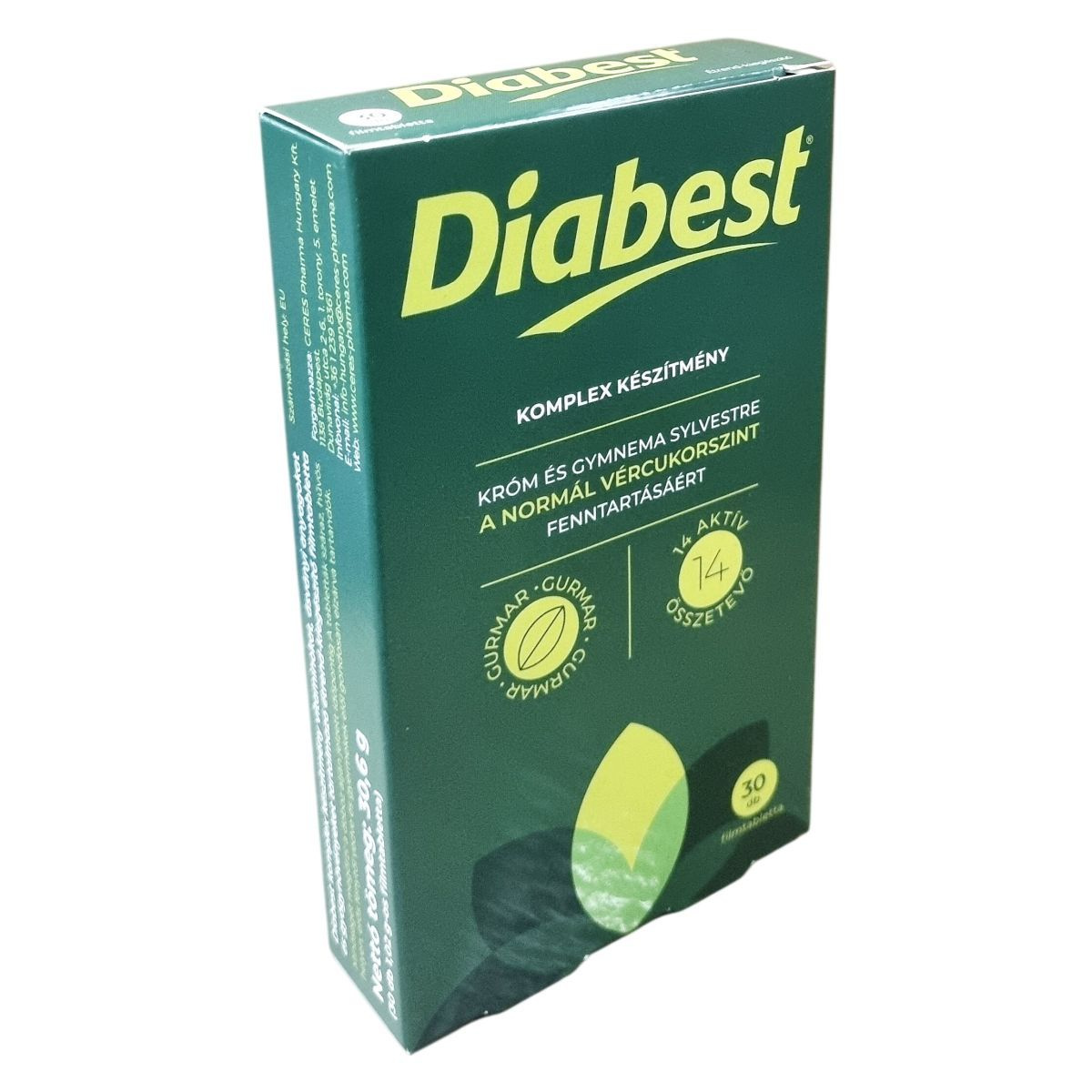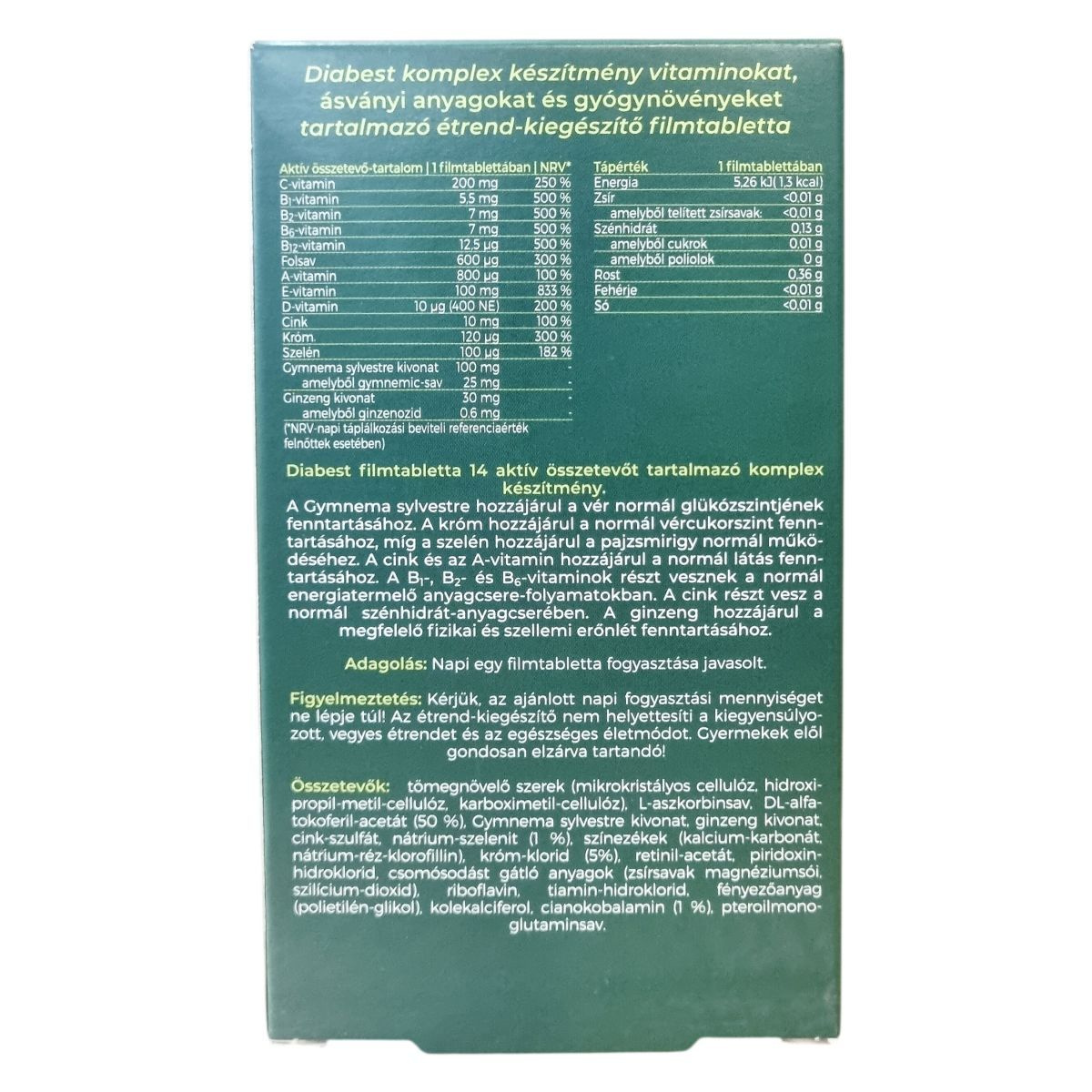 A Diabest filmtabletta 14 aktív összetevőt tartalmazó komplex készítmény. A Gymnema sylvestre hozzájárul a vér normál glükózszintjének fenntartásához. A króm támogathatja a normál vércukorszint fenntartását, míg a szelén hozzájárulhat a pajzsmirigy normál működéséhez. A cink és az A-vitamin révén támogatható a normál látás fenntartása. A B1-, B2- és B6-vitaminok részt vehetnek a normál energiatermelő anyagcsere-folyamatokban. A cink részt vehet a normál szénhidrát-anyagcserében. A ginzeng hozzájárulhat a megfelelő fizikai és szellemi erőnlét fenntartásához.