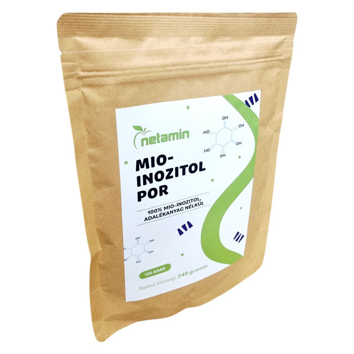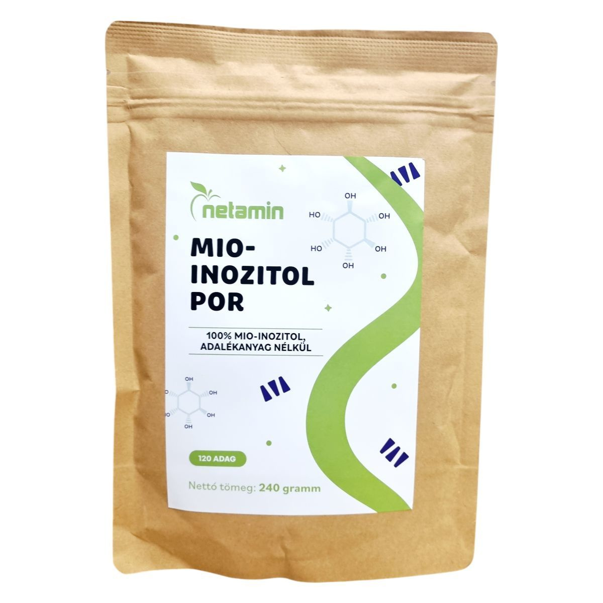 A Netamin Mio-inozitol por 100% mio-inozitolt tartalmaz, adalékanyagok nélkül. Egy csomag 120 adagot tartalmaz. A por folyadékban elkeverve fogyasztható, lehetőleg étkezések előtt vagy közben.