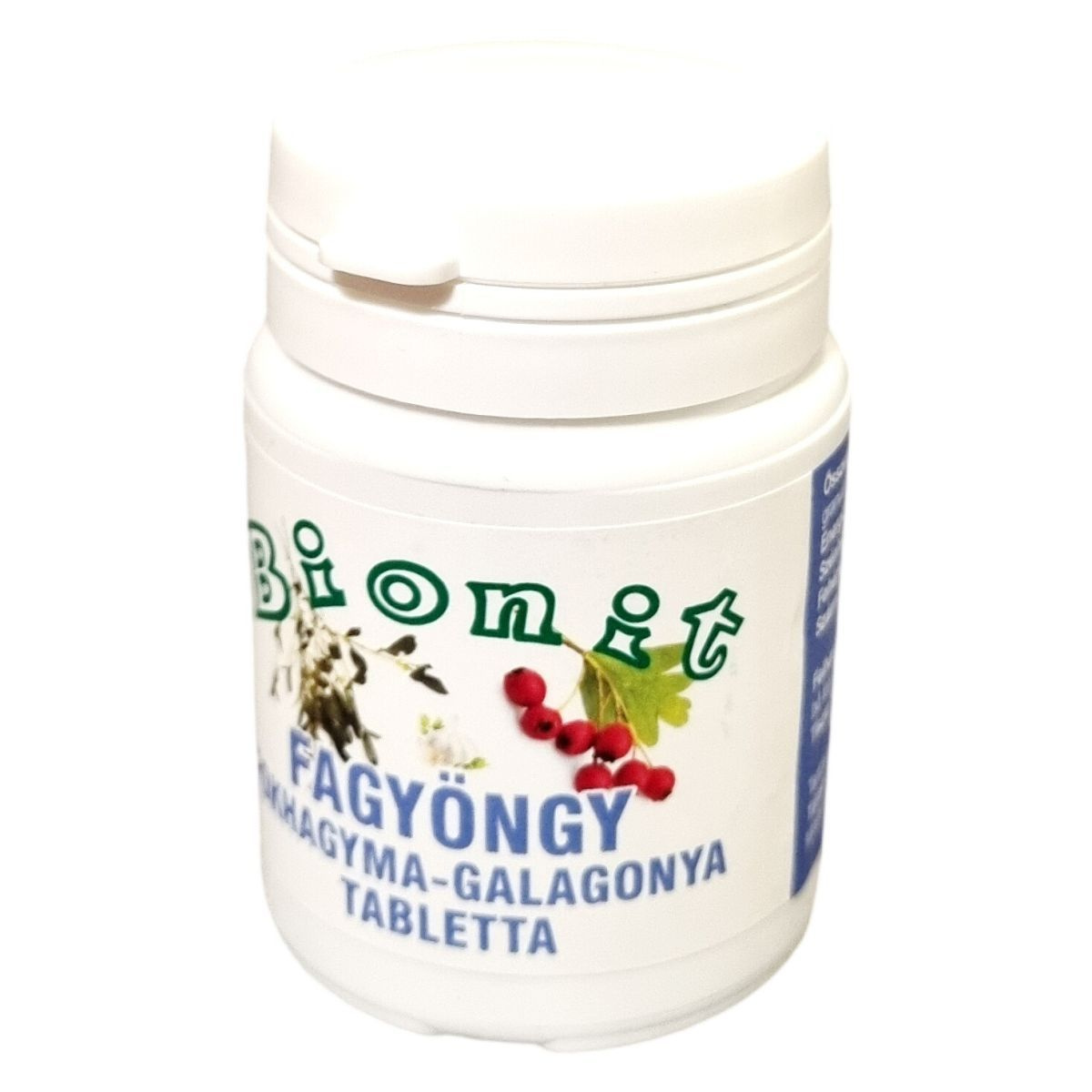 A Bionit Fagyöngy Fokhagyma-Galagonya tabletta egy gyógynövényalapú étrend-kiegészítő, amely galagonyát és fokhagyma granulátumot tartalmaz. A termék össztömege 50 gramm, ami körülbelül 150 tablettának felel meg. A készítmény nem tartalmaz tartósítószert, mesterséges színezéket vagy aromákat. Az energiabevitel 177,64 kcal 100 grammonként, a zsír- és fehérjetartalom alacsony, míg a szénhidráttartalom jelentős, melynek fő részét a szőlőcukor teszi ki. A tabletták fogyasztása naponta többször, bő folyadékkal ajánlott; a tablettákat szétrágás nélkül kell lenyelni. A termék származási helye az Európai Unió.