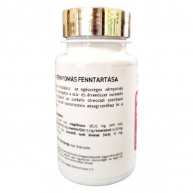 A Pharmacoidea Vérnyomás fenntartása étrend-kiegészítő kapszula természetes összetevőivel, mint a koenzim Q10, vörös szőlőmag kivonat és resveratrol, hozzájárulhat a normál vérnyomás fenntartásához. A termék magnéziumot, káliumot és szelént is tartalmaz, amelyek támogathatják a szív- és érrendszer normális működését, valamint segíthetnek az oxidatív stresszel szembeni védelemben. A folsav és a szurokfű levél kivonat további támogatást nyújthat a normál homocisztein anyagcseréhez és a vérképződéshez. A termék 60 kapszulás kiszerelésben kapható, és napi 1 kapszula fogyasztása ajánlott.