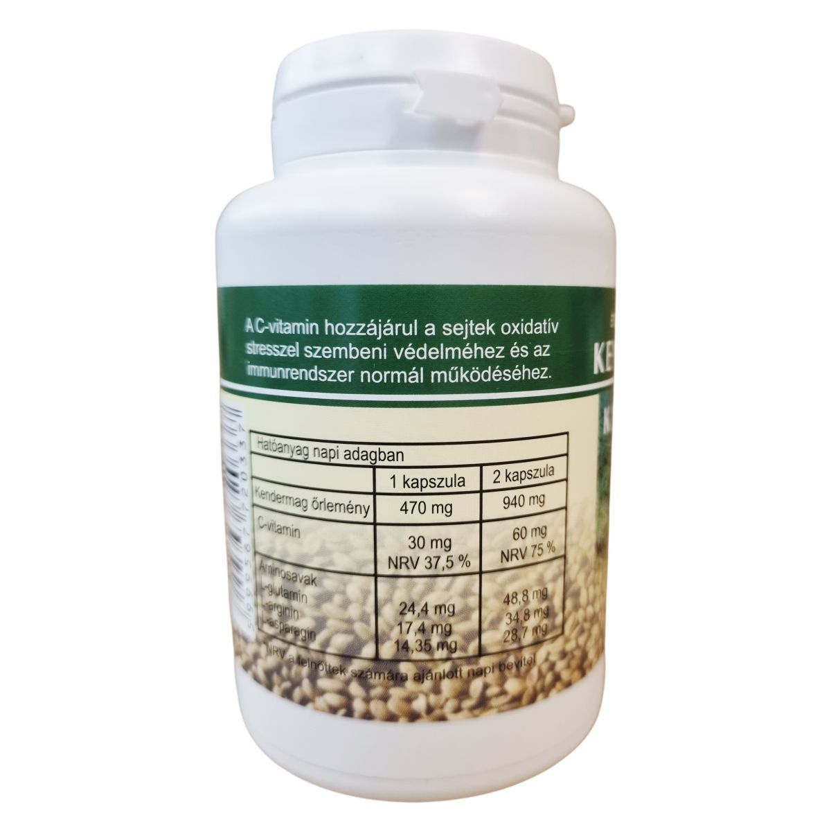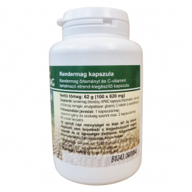 Kendermag őrleményt és C-vitamint tartalmazó étrend-kiegészítő kapszula. A C-vitamin hozzájárul a sejtek oxidatív stresszel szembeni védelméhez és az immunrendszer normál működéséhez. Nettó tömeg: 62 g (100 x 620 mg).