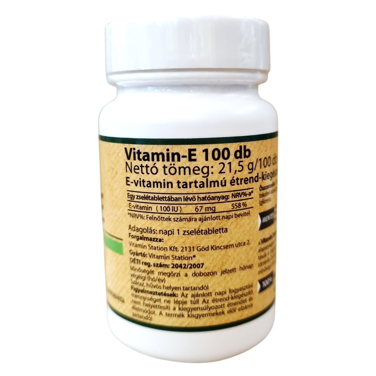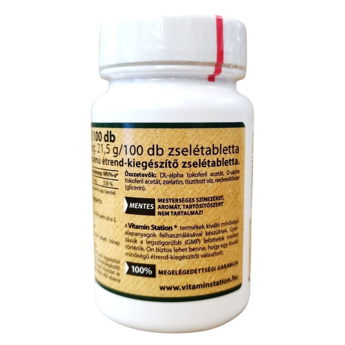 E-vitamin tartalmú étrend-kiegészítő zselétabletta, 100 IU E-vitamin hatóanyag-tartalommal.