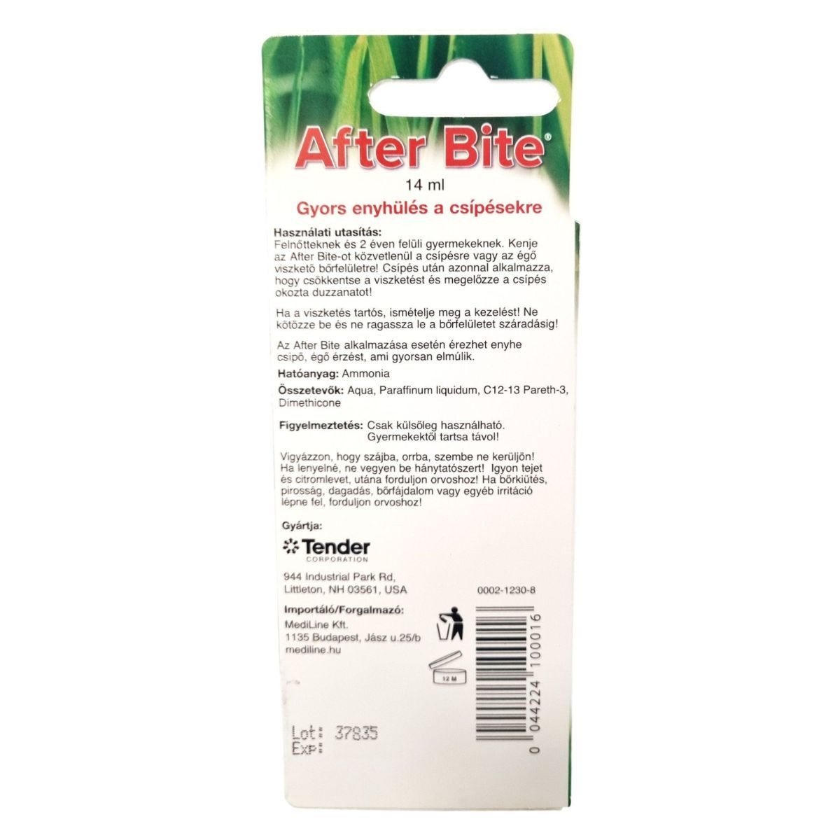 Az After Bite egy hatékony készítmény, amely gyors enyhülést nyújt a különböző rovarcsípések és növényi érintkezések okozta viszketés csillapítására. A termék alkalmazása során enyhe csípő, égő érzés jelentkezhet, amely gyorsan elmúlik. A terméket a Tender CORPORATION gyártja az USA-ban, és a MediLine Kft. forgalmazza Magyarországon. A termék használata során fontos, hogy a bőrfelületet ne kötözzük be, és ne ragasszuk le száradásig. A termék kizárólag külsőleg alkalmazható, és különös figyelmet kell fordítani arra, hogy ne kerüljön szembe, szájba vagy orrba.