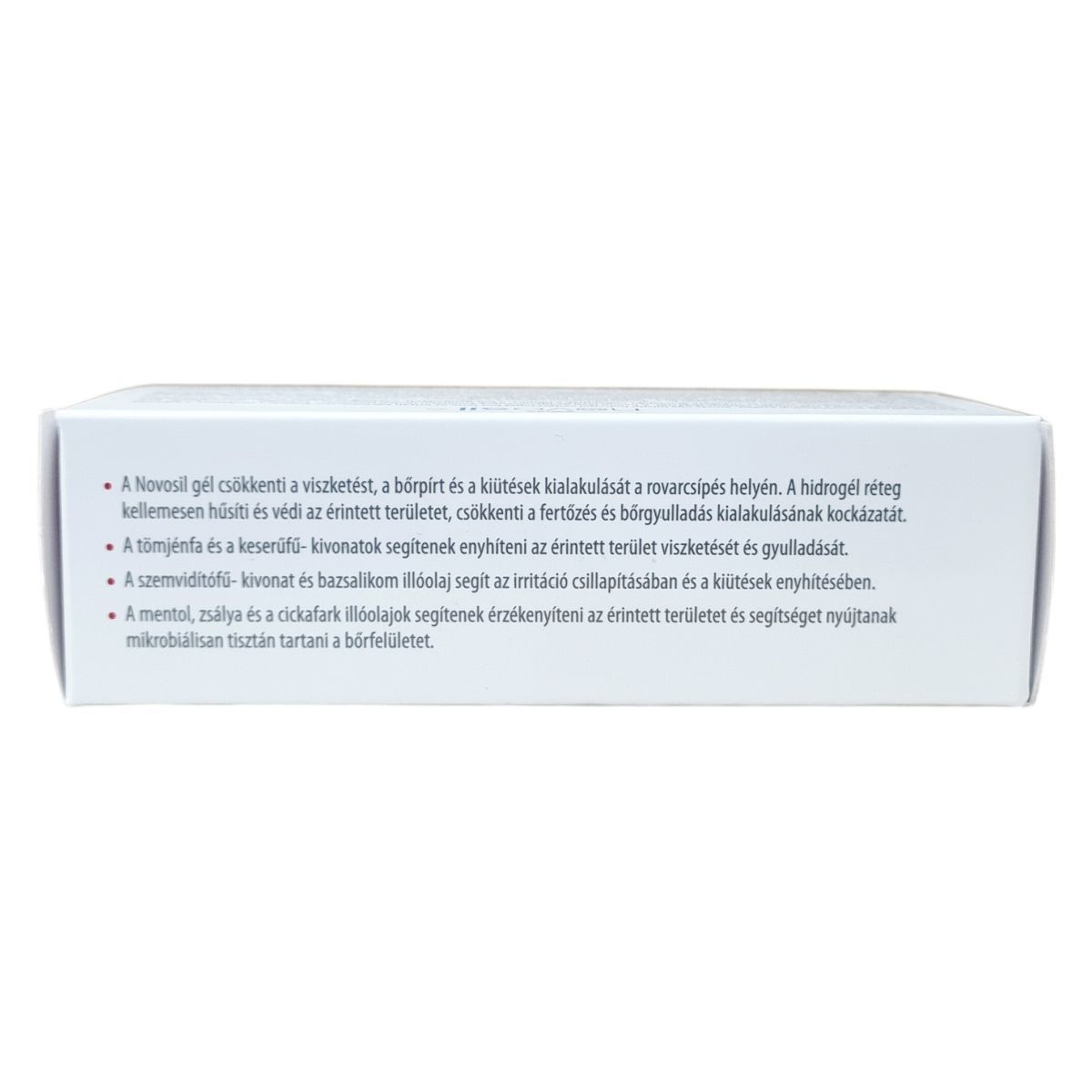 A Novosil gél olyan orvostechnikai eszköz, amely hidrogel rétegként hűsíti és védi az irritált bőrfelületet, csökkentve a viszketést, bőrpírt és a kiütéseket, továbbá segít megelőzni a fertőzések és bőrgyulladások kialakulását. A benne található gyógynövény kivonatok és illóolajok, mint az indiai tömjénfa, keserűfű, szemvidítófű, mentol, bazsalikom, zsálya és cickafark természetes módon enyhítik a bőrirritációt, csillapítják az allergiás és atópiás bőrtüneteket, valamint mikrobiális tisztán tartják az érintett bőrfelületet.