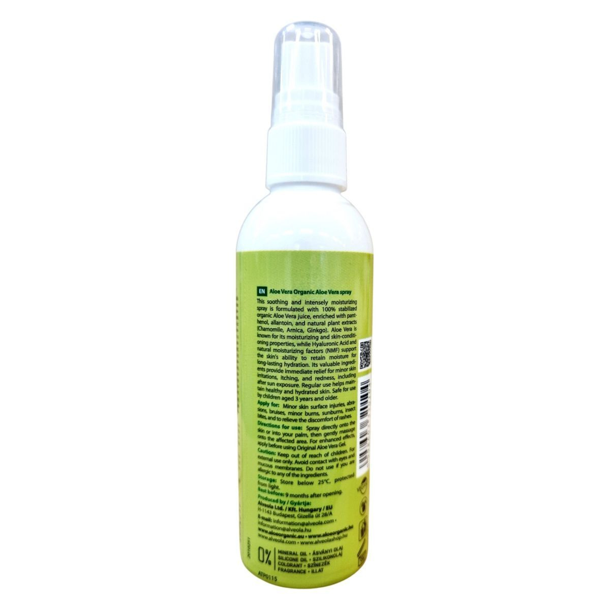 Az Aloe Vera Organic Aloe Spray természetes alapú, organikus összetevőket tartalmazó bőrápoló permet, amely azonnali frissítő és nyugtató hatást biztosíthat a bőr számára. A stabilizált Aloe Vera juice, a hialuronsav és a pantenol kombinációja elősegítheti a bőr regenerációját és hosszú távú hidratáltságát, míg a kamilla, az árnika és a ginkgo természetes kivonatai támogatják a bőr megújulását és védelmét. Különösen ajánlott napozás után, rovarcsípés, bőrirritáció vagy borotválkozás utáni ápolásra. Alkohol-, illatanyag- és színezékmentes, érzékeny bőrre is használható, mindennapos testápolási rutin részeként.