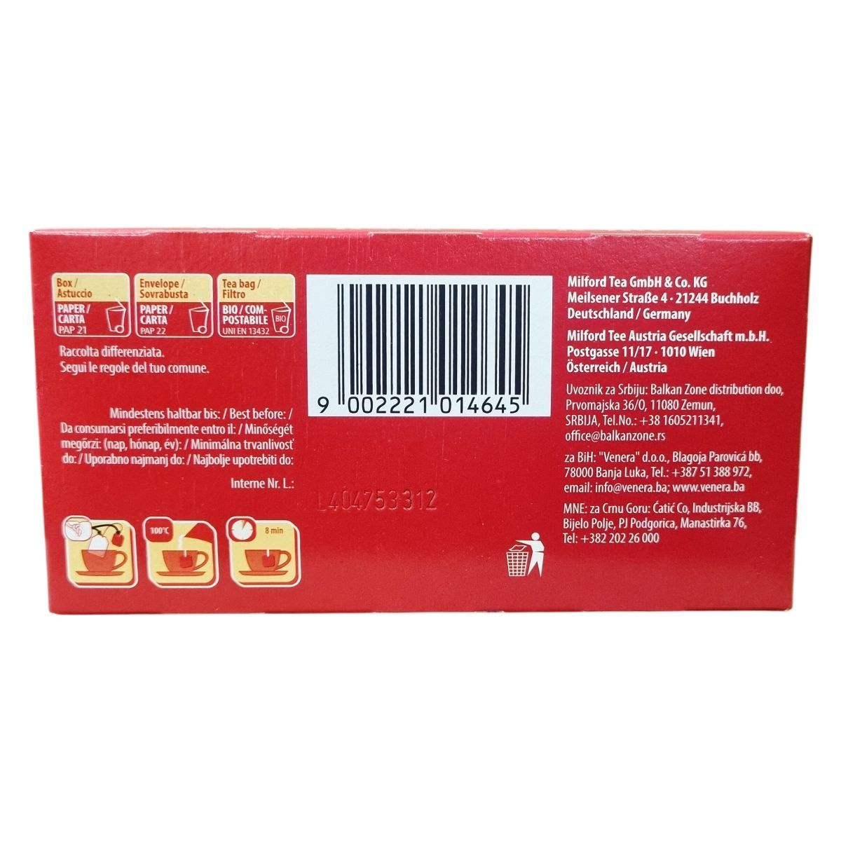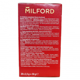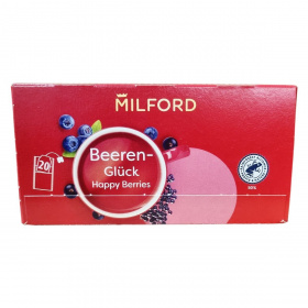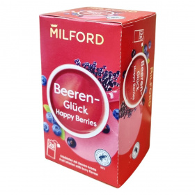 A Milford Beeren-Glück Happy Berries gyümölcstea természetes, minőségi összetevőkből áll, melyek között hibiszkusz, alma, csipkebogyó, fekete ribizli, bodzabogyó és áfonya szerepel. A termék 50%-ban Rainforest Alliance tanúsítvánnyal rendelkező alapanyagokat tartalmaz, amely fenntartható gazdálkodást biztosít. A papírdoboz és szétválasztható csomagolóanyagok a szelektív hulladékgyűjtéshez megfelelőek, a tea filter pedig komposztálható. A terméket Németországban állítják elő, majd több országbeli forgalmazóval értékesítik, többek között Ausztriában, Szerbiában, Bosznia-Hercegovinában és Montenegróban is.
