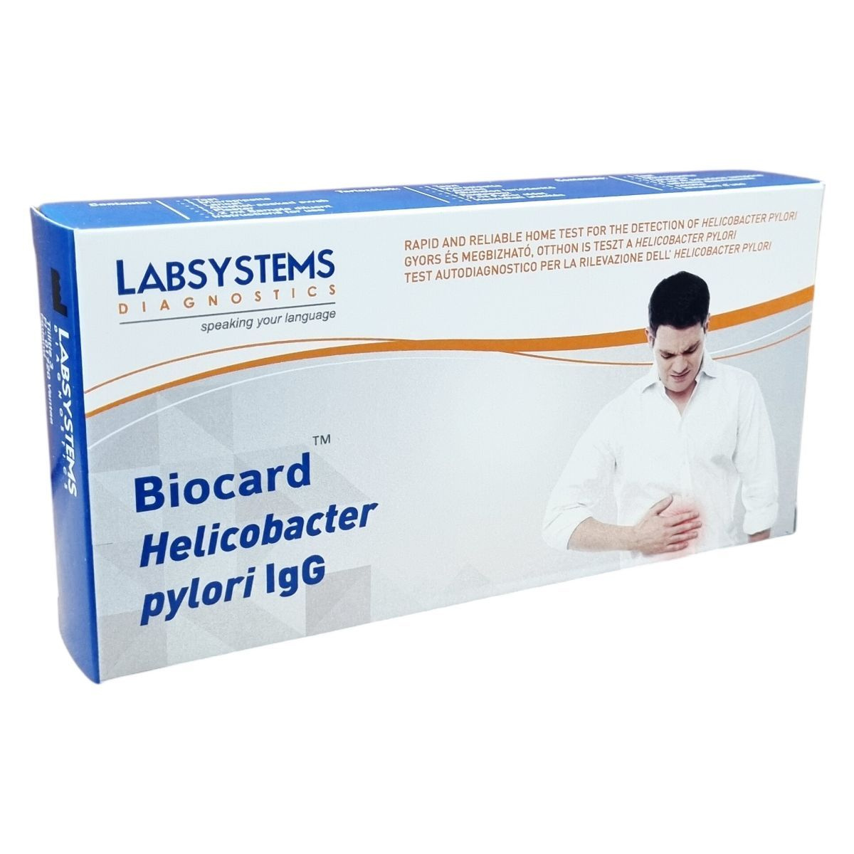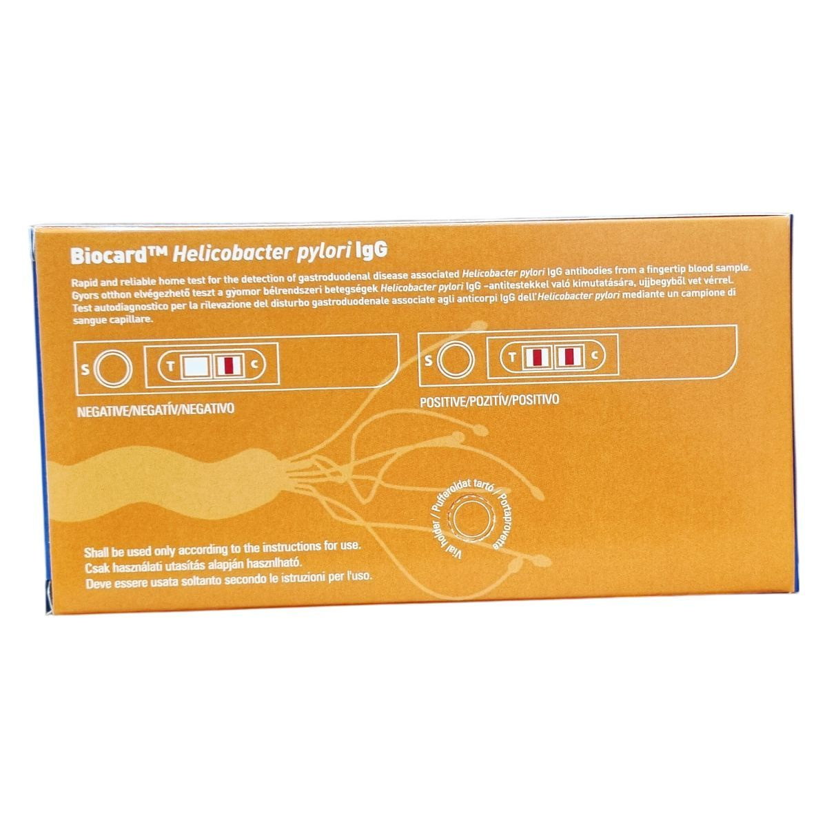 A Biocard™ Helicobacter pylori IgG teszt egy gyorsan elvégezhető otthoni diagnosztikai eszköz, amely segítségével a gastroduodenalis megbetegedésekhez köthető Helicobacter pylori antitestek jelenlétét lehet kimutatni. A csomag tartalmaz egy tesztkészletet, micropipettát, lándzsát, alkoholos fertőtlenítőt, ragasztószalagot, valamint egy 1,2 ml pufferoldatot és használati utasítást. A mintavétel ujjbegyből történik, a teszt eredménye pozitív vagy negatív lehet, a használat kizárólag a mellékelt útmutató szerint ajánlott. A termék a laboratóriumi diagnosztikai eszközök közé tartozik és CE jelzéssel rendelkezik.