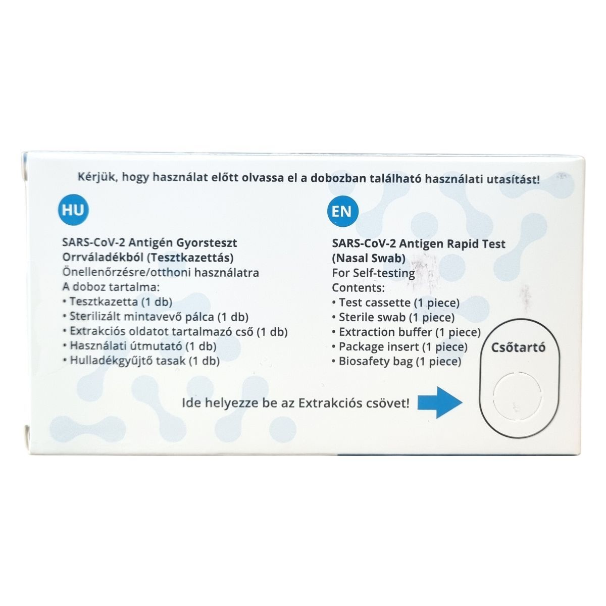 A SARS-CoV-2 Antigén Gyorsteszt egy tesztkazettás gyorsteszt, amely az orrváladékból mutatja ki a SARS-CoV-2 antigént. A doboz tartalmaz egy tesztkazettát, steril mintavevő pálcát, extrakciós oldatot tartalmazó csövet, használati útmutatót és hulladékgyűjtő tasakot. A teszt az önellenőrzésre és otthoni használatra lett kifejlesztve. A termék rendelkezik CE jelöléssel, és az IVD besorolás szerint tanúsított. A gyártó a Hangzhou AllTest Biotech Co.,Ltd. (Kína), a forgalmazó pedig a White Supply Kft. (Magyarország). Az extrakciós csövet a csőtartóba kell helyezni a használat során.