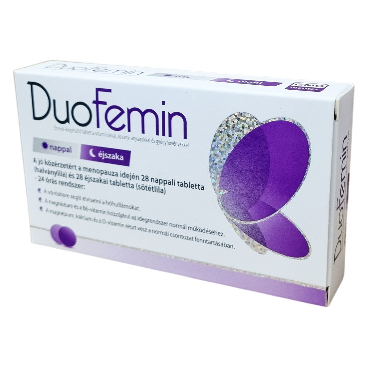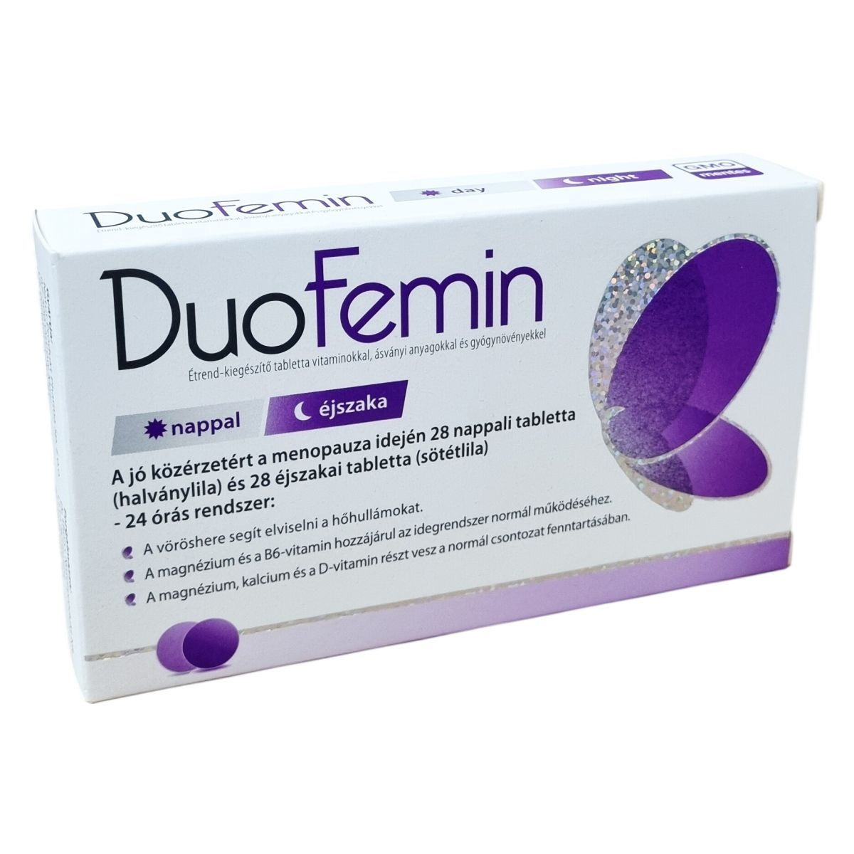 A DuoFemin egy speciális étrend-kiegészítő, amely nappali és éjszakai tablettákból áll, így 24 órás támogatást nyújthat a menopauza idején. A nappali tabletták fő hatóanyagai közé tartozik a vöröshere kivonat, amely segítheti a hőhullámok elviselését. A magnézium és B6-vitamin hozzájárulhat az idegrendszer normál működéséhez, valamint a magnézium, kalcium és D-vitamin támogatja a normál csontozat fenntartását. Az éjszakai tabletták tartalmaznak kalciumot, D3-vitamint, folsavat, szójabab-kivonatot és komlótermés port, melyek kombinációja hozzájárulhat a szervezet éjszakai regenerálódásához. Az adagolás egyszerű, naponta két tablettát szükséges bevenni, egyet reggel és egyet este, vízzel. Az allergén információ alapján szójababra allergiások számára nem ajánlott a termék szedése. A DuoFemin rendszeres használata mellett fontos a kiegyensúlyozott étrend és az egészséges életmód fenntartása.