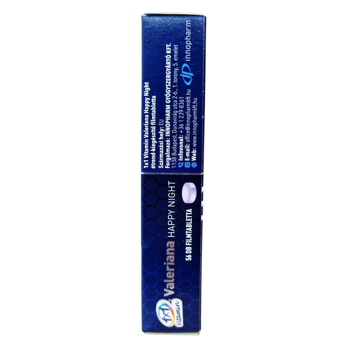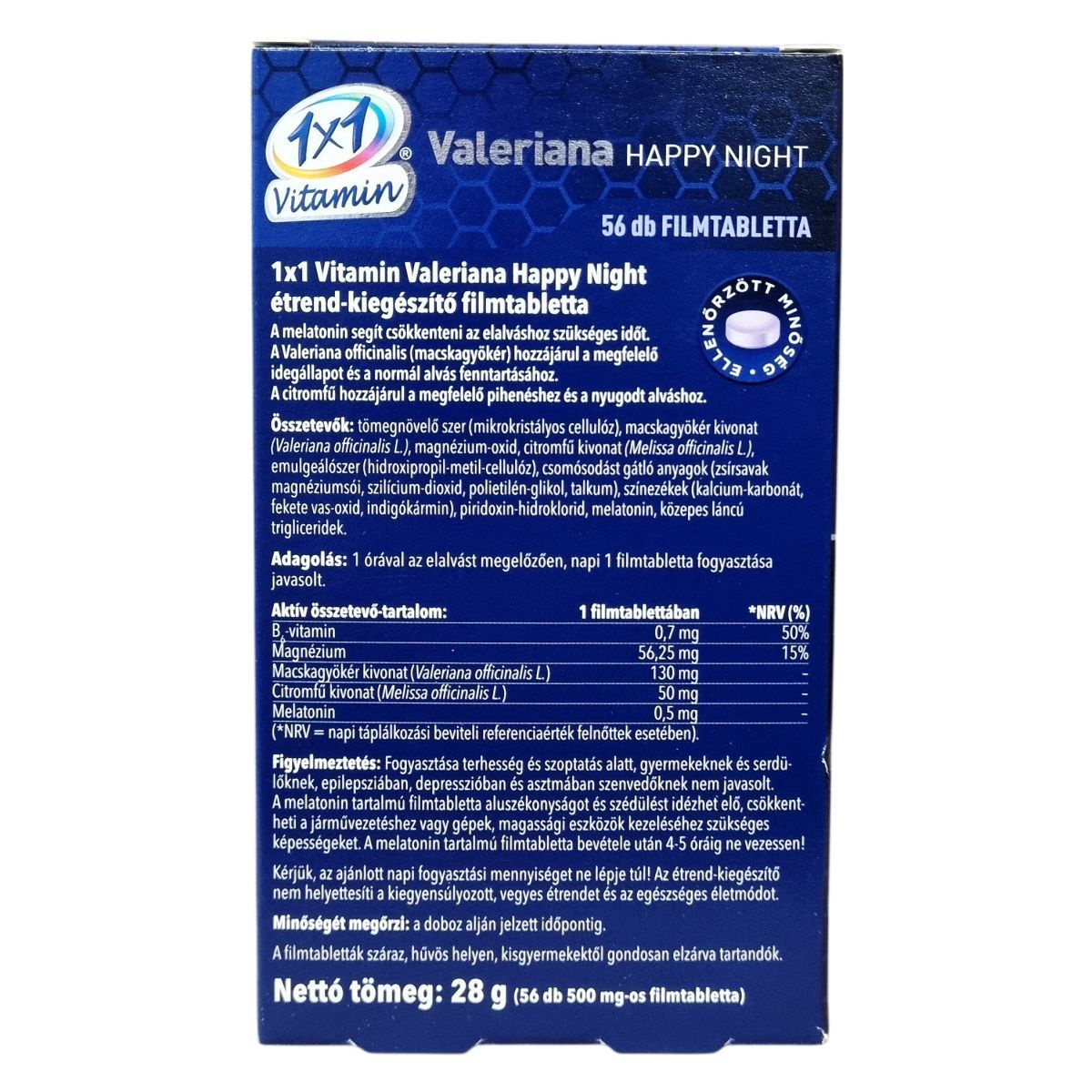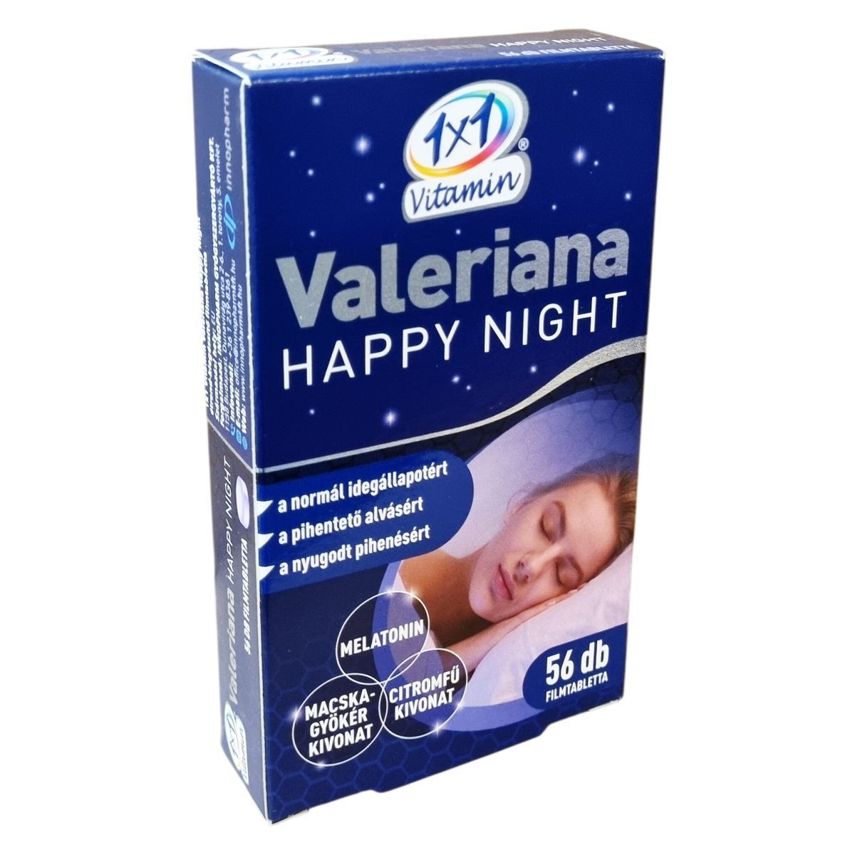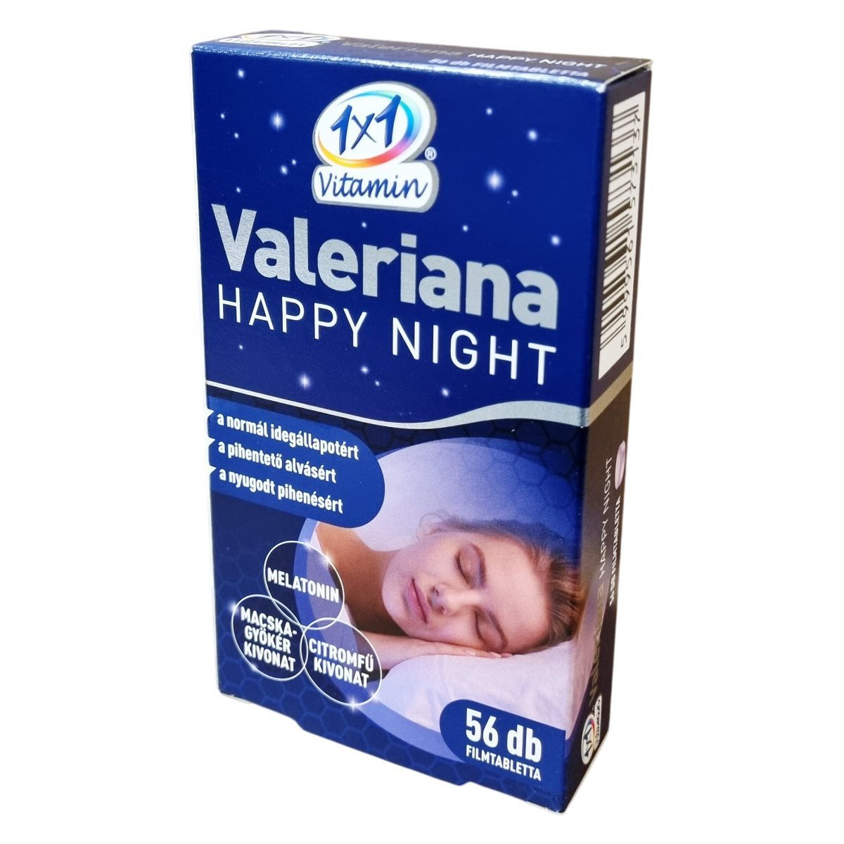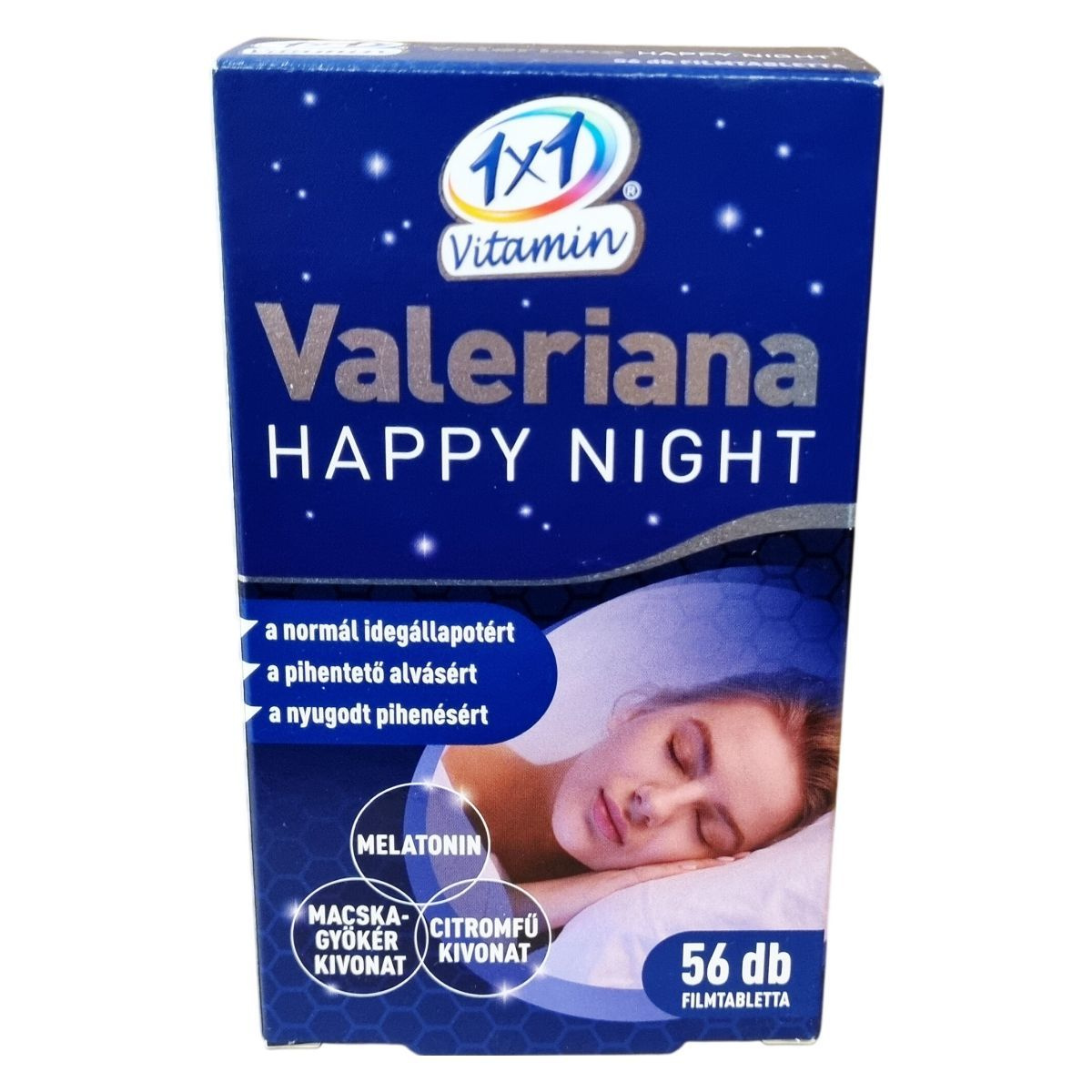 A 1x1 Vitamin Valeriana Happy Night étrend-kiegészítő filmtabletta melatonin, macskagyökér (Valeriana officinalis L.) kivonat és citromfű (Melissa officinalis L.) kivonat komplexét tartalmazza. A melatonin segíthet csökkenteni az elalváshoz szükséges időt, míg a macskagyökér hozzájárulhat a megfelelő idegállapot és a normál alvás fenntartásához. A citromfű támogatja a megfelelő pihenést és a nyugodt alvást. A filmtabletták 500 mg-osak, és 56 darab található egy dobozban. A termék származási helye az Európai Unió. Felhívjuk a figyelmet arra, hogy a melatonintartalmú filmtabletta bevétele után nem ajánlott autót vezetni vagy gépeket kezelni 4-5 órán keresztül. A termék nem alkalmas terhes vagy szoptató nők, gyermekek és serdülők, valamint epilepsziás, depressziós vagy asztmás személyek számára.