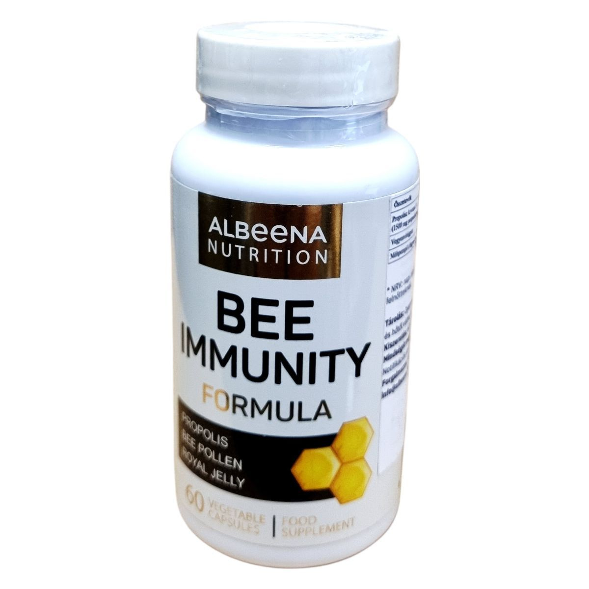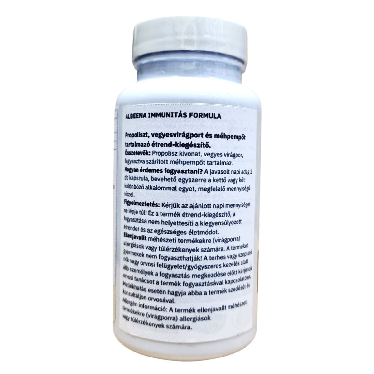 Az ALBEENA BEE IMMUNITY FORMULA egy étrend-kiegészítő, amely propoliszt, vegyesvirágport és méhpempőt tartalmaz. Ezek az összetevők hozzájárulhatnak az immunrendszer támogatásához. A termék 60 kapszulás kiszerelésben kapható, és a javasolt napi adag 2 kapszula. Fontos, hogy az ajánlott napi mennyiséget ne lépje túl, és a termék nem helyettesíti a kiegyensúlyozott étrendet és az egészséges életmódot. A termék ellenjavallt méhészeti termékekre allergiások számára, és gyermekek nem fogyaszthatják. Tárolása gyermekek elől elzárva, száraz helyen, fénytől és hőtől védve javasolt.