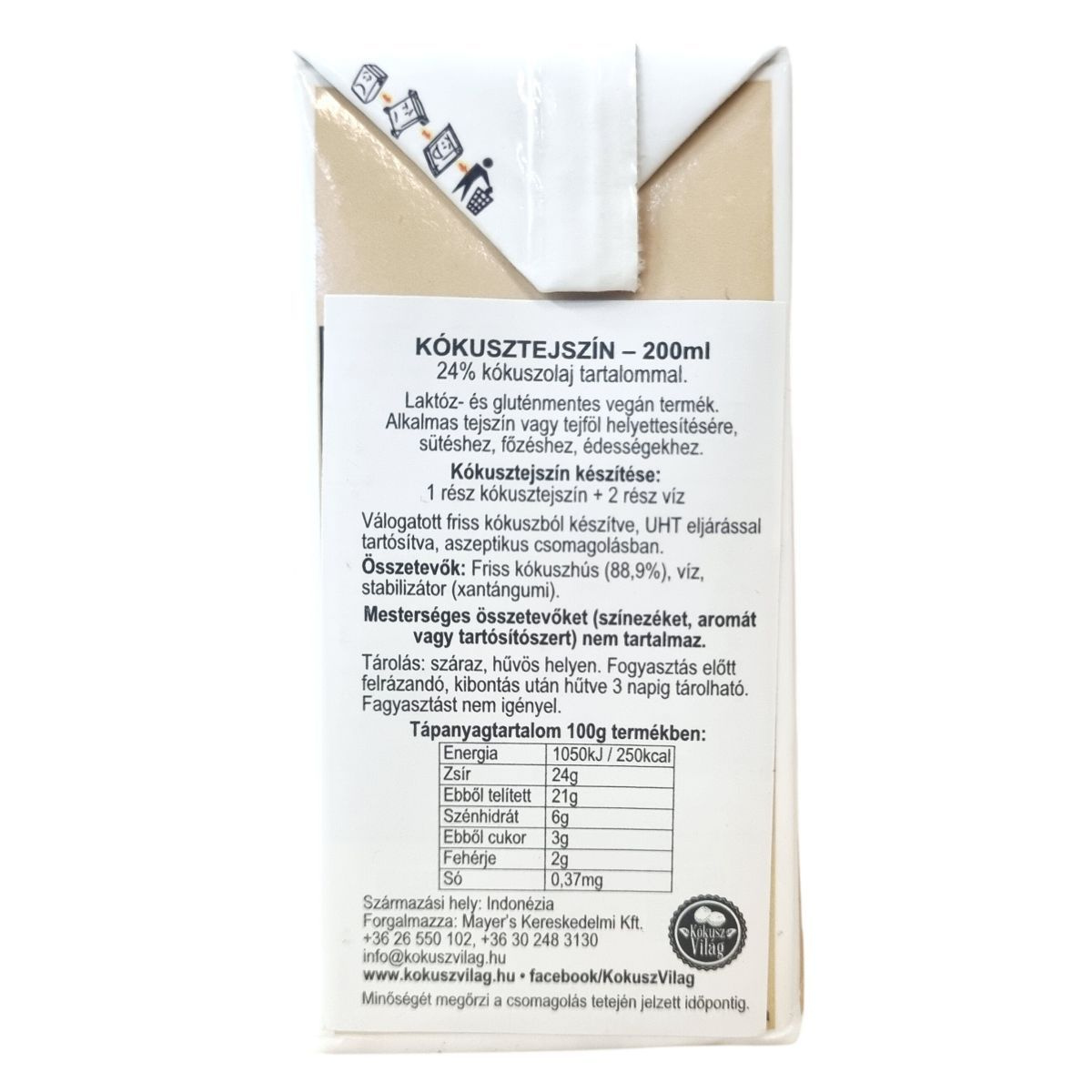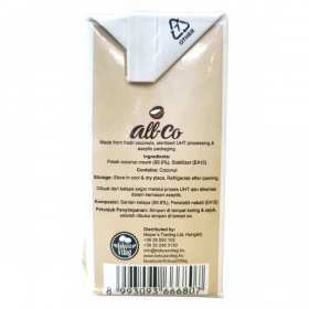 A termék válogatott friss kókuszból készül, UHT eljárással tartósítva és aszeptikus csomagolásban. Nem tartalmaz mesterséges színezéket, aromát vagy tartósítószert. Használata egyszerű, számos gasztronómiai feladatban kiválóan alkalmazható, helyettesítve a hagyományos tejszínt vagy tejfölt. A csomagoláson megtalálható a gyártási kód, és a legjobb minőségű fogyaszthatóság ellenőrzéséhez a csomagolás tetején jelzett időpont.