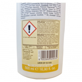 Ez a BIO multisurface tisztítószer antibakteriális és atkairtó hatással rendelkezik a természetes bio teafaolajnak köszönhetően. Alkalmas különböző felületek és használati tárgyak tisztántartására. A termék használata során fontos a megfelelő védőfelszerelés viselése és a gyerekektől való elzárás. A flakon 75%-ban újrahasznosított műanyagból készült, elősegítve a környezettudatosságot. Az olasz Pierpaoli srl gyártja, és a termék Magyarországon az Ökomarket Kft. forgalmazásában érhető el.