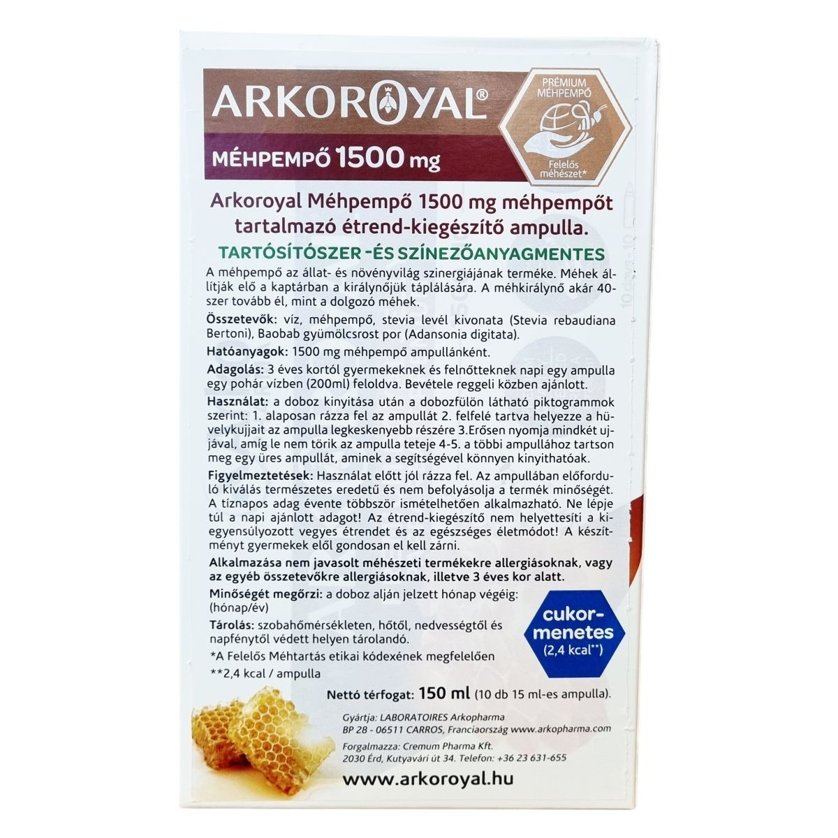 Az Arkoroyal Méhpempő Royal Jelly, Stevia levélkivonat és Baobab gyümölcspép alapú étrend-kiegészítő, amely cukor-, tartósítószer- és vegyi anyagmentes. A méhpempőt a méhek állítják elő a kaptárban, hogy táplálják a királynőt, amely akár 40-szer tovább élhet a dolgozó méheknél. A készítmény gyermekek és felnőttek számára egyaránt alkalmas, a 10 napos adag akár többször is ismételhető az év során. Figyelembe kell venni a használati utasításokat, az ampulla nyitása és fogyasztása során követendő lépéseket, valamint a termék érzékenységi és tárolási követelményeit, tárolva a terméket száraz, hűvös, napfénytől védett helyen. Nem ajánlott allergiásoknak és 3 év alatti gyermekeknek.