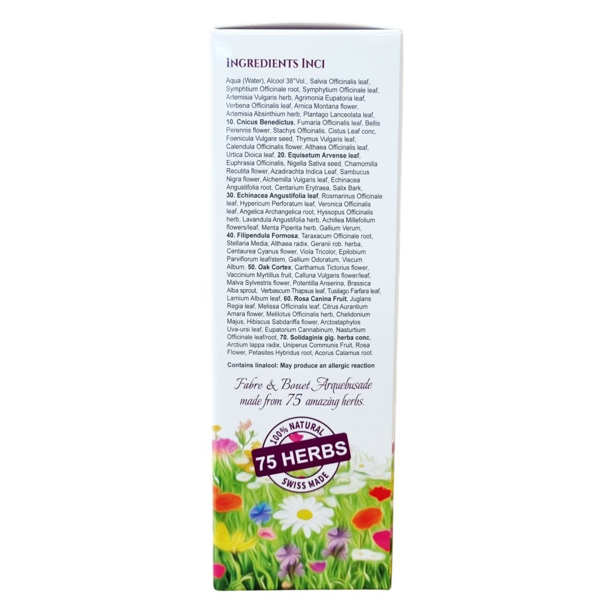 Aqua (Water), Alcool 38°Vol., Salvia Officinalis leaf, Symphitum Officinale root, Symphytum Officinale leaf, Artemisia Vulgaris herb, Agrimonia Eupatoria leaf, Verbena Officinalis leaf, Arnica Montana flower, Artemisia Absinthium herb, Plantago Lanceolata leaf, Cnicus Benedictus, Fumaria Officinalis leaf, Bellis Perennis flower, Stachys Officinalis, Cistus Leaf conc, Foenicula Vulgare seed, Thymus Vulgaris leaf, Calendula Officinalis flower, Althaea Officinalis leaf, Urtica Dioica leaf, Equisetum Arvense leaf, Euphrasia Officinalis, Nigella Sativa seed, Chamomilla Recutita flower, Azadirachta Indica Leaf, Sambucus Nigra flower, Alchemilla Vulgaris leaf, Echinacea Angustifolia root, Centarium Erytraea, Salix Bark, Echinacea Angustifolia leaf, Rosmarinus Officinale leaf, Hypericum Perforatum leaf, Veronica Officinalis leaf, Angelica Archangelica root, Hyssopus Officinalis herb, Lavandula Angustifolia herb, Achillea Millefolium flowers/leaf, Menta Piperita herb, Gallium Verum, Filipendula Formosa, Taraxacum Officinale root, Stellaria Media, Althaea radix, Gerani rob. herba, Centuarea Cyanus flower, Viola Tricolor, Epilobium Parviflorum leaf/stem, Galium Odoratum, Viscum Album, Oak Cortex, Carthamus Tictorius flower, Vaccinium Myrtillus fruit, Calluna Vulgaris flower/leaf, Malva Sylvestris flower, Potentilla Anserina, Brassica Alba sprout, Verbascum Thapsus leaf, Tussilago Farfara leaf, Lamium Album leaf, Rosa Canina Fruit, Juglans Regia leaf, Melissa Officinalis leaf, Citrus Aurantium Amara flower, Melilotus Officinalis herb, Chelidonium Majus, Hibiscus Sabdariffa flower, Arctostaphylos Uva-ursi leaf, Eupatorium Cannabinum, Nasturtium Officinale leaf/root, Solidaginis gig. herba conc, Arctium lappa radix, Uniperus Communis Fruit, Rosa Flower, Petasites Hybridus root, Acorus Calamus root.