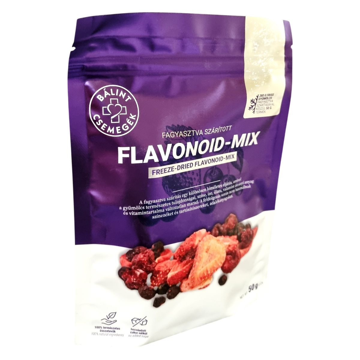 A Bálint Csemegék fagyasztva szárított flavonoid-mix egy kíméletes technológiával készült termék, amely megtartja a gyümölcsök természetes színét, ízét, illatát és értékes vitamin- valamint ásványianyag-tartalmát. A feldolgozás során nem használnak színezéket, tartósítószert vagy adalékanyagot. Az 50 gramm késztermék előállításához 380 gramm friss gyümölcsöt használnak fel, amely wild cseresznyéből, kékáfonyából és eperből áll. A termék kiváló választás lehet vegetáriánus és paleolit étrendet követők számára.