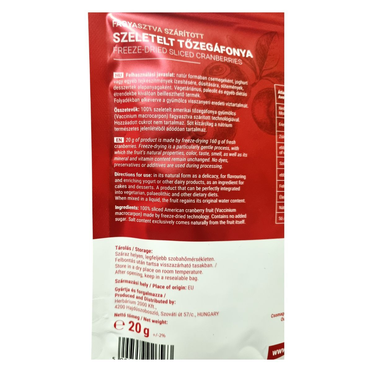 A termék fagyasztva szárított szeletelt amerikai tőzegáfonya, mely megőrzi természetes színét, ízét és tápanyagtartalmát, adalékanyagok nélkül.