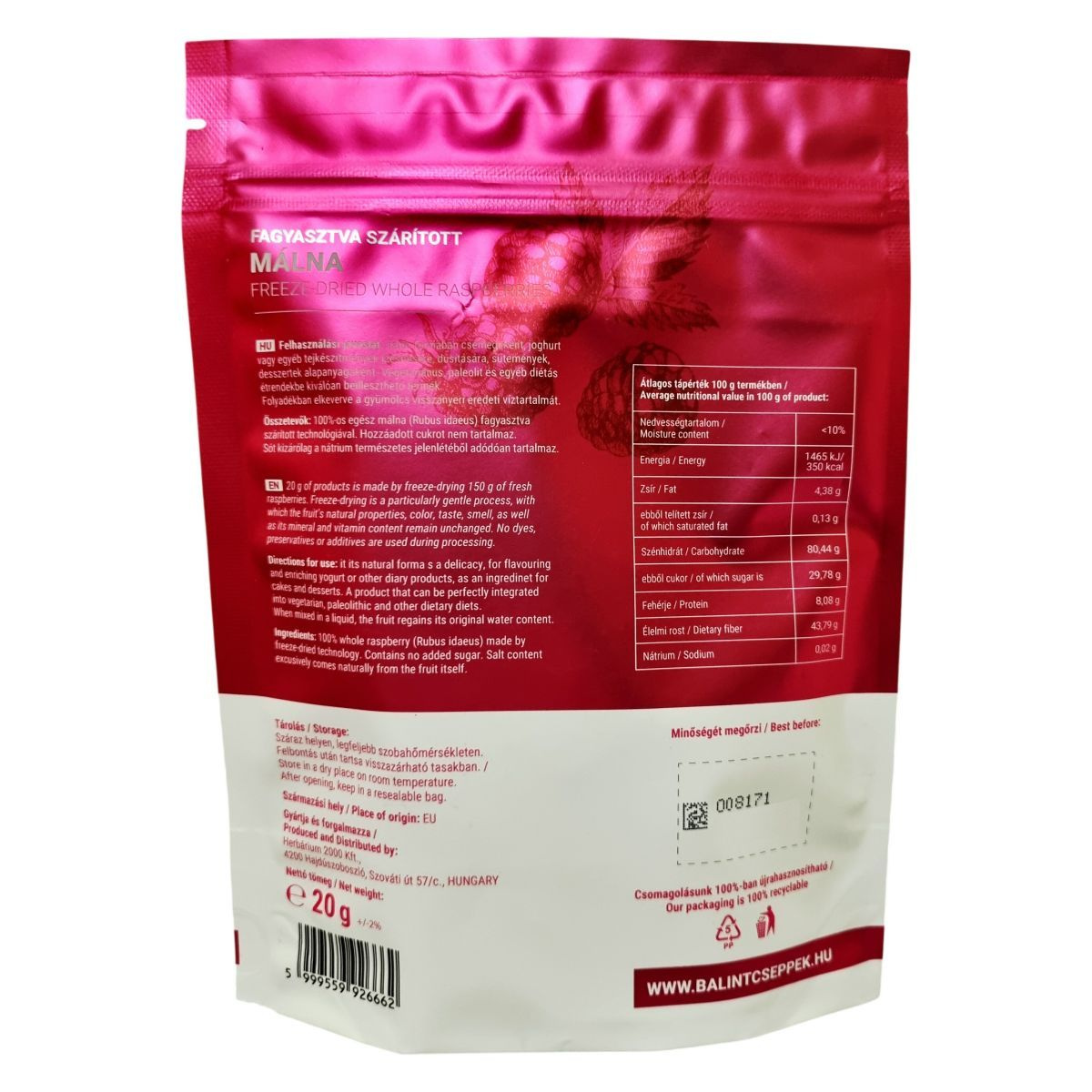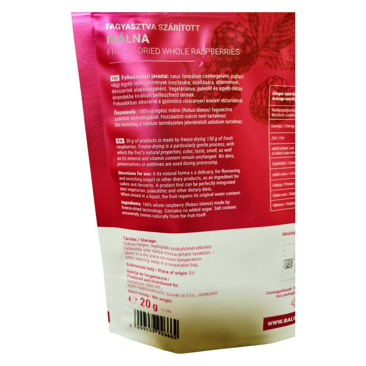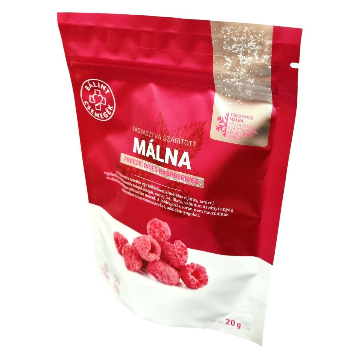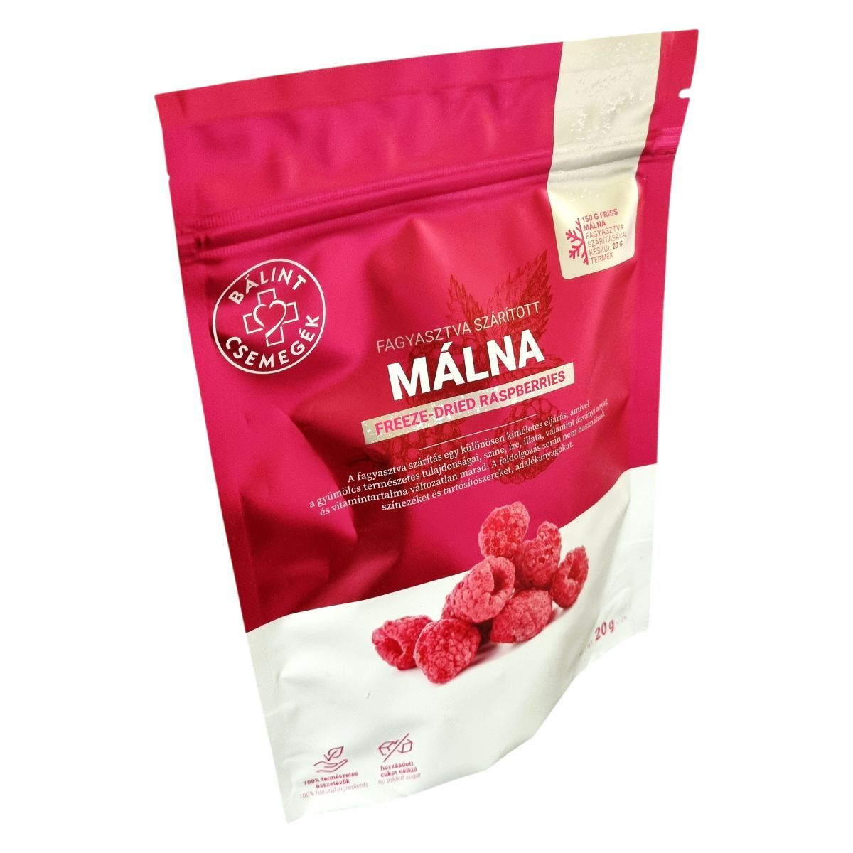 A fagyasztva szárítás különösen kíméletes feldolgozási módszer, amely segítségével a málna minden értékes tulajdonsága megőrződik, ideértve a természetes színt, illatot, ízt, ásványi anyagokat és vitaminokat. A termék nem tartalmaz színezékeket, tartósítószereket vagy adalékanyagokat. Egyedül a gyümölcs nátriumtartalma jelenik meg a só mennyiségében. A termék paleolit és egyéb diétás étrendbe is jól illeszthető, és csomagolása 100%-ban újrahasznosítható. A 20 g termék előállításához 150 g friss málnát dolgoznak fel.