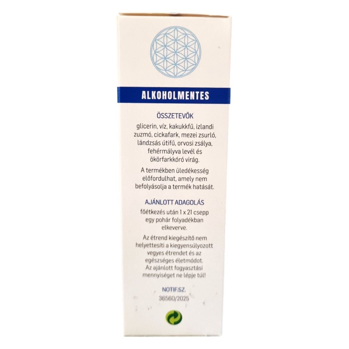 Glicerin, víz, kakukkfű, izlandi zuzmó, cickafark, mezei zsurló, lándzsás útifű, orvosi zsálya, fehérmályva levél, ökörfarkkóró virág.