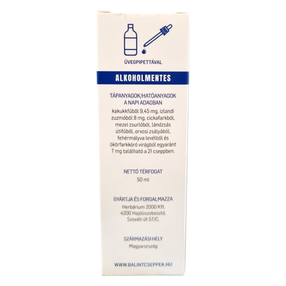 A BÁLINT CSEPPEK TÜDŐBARÁT CSEPPEK egy alkoholmentes, folyékony étrend-kiegészítő készítmény, amely különböző növényi összetevőket tartalmaz. A termék célja, hogy támogassa a tüdő egészségét a benne található gyógynövények révén. Az összetevők között megtalálható a kakukkfű, izlandi zuzmó, cickafark, mezei zsurló, lándzsás útifű, orvosi zsálya, fehérmályva levél és ökörfarkkóró virág. A készítmény üledékessége természetes jelenség, amely nem befolyásolja a termék hatását. A termék Magyarországon készül, és a Herbárium 2000 Kft. gyártja és forgalmazza.