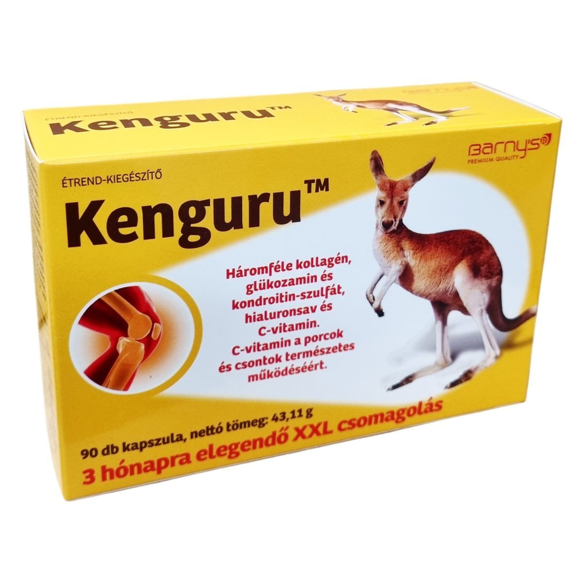 A Barnys Kenguru termék kombinált állati eredetű hatóanyagokat és vitamint tartalmazó étrend-kiegészítő, mely 3 fajta kollagént, glükozamint és kondroitin-szulfátot, hialuronsavat és C-vitamint tartalmaz. A C-vitamin hozzájárul a normál kollagénképződéshez és ezen keresztül: a porcok megfelelő állapotának, működésének és a normális csontozat fenntartásához.