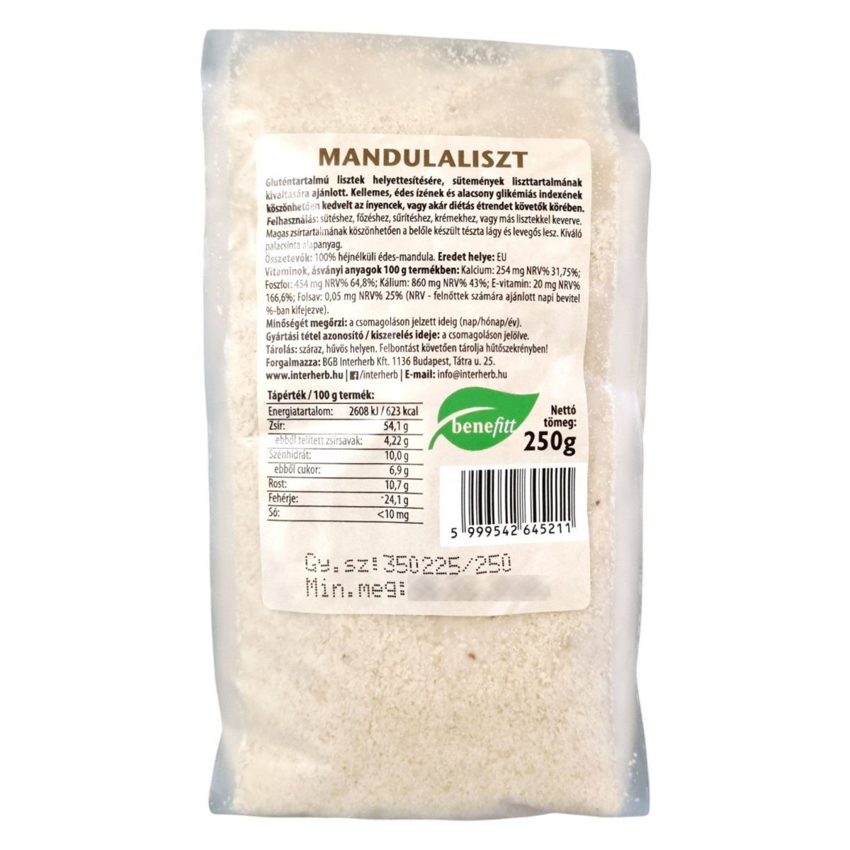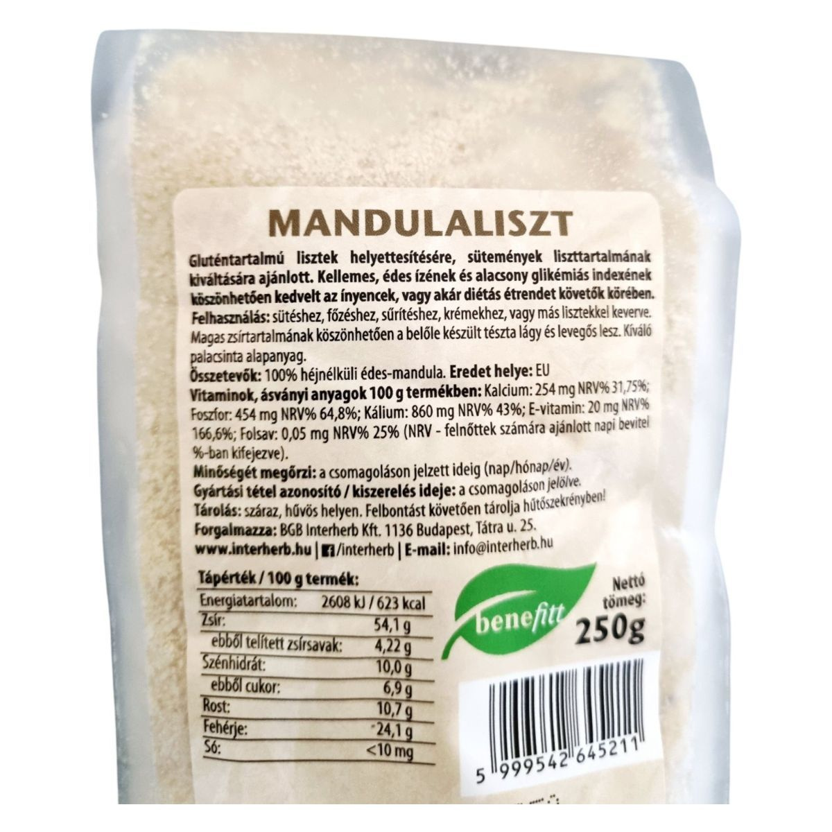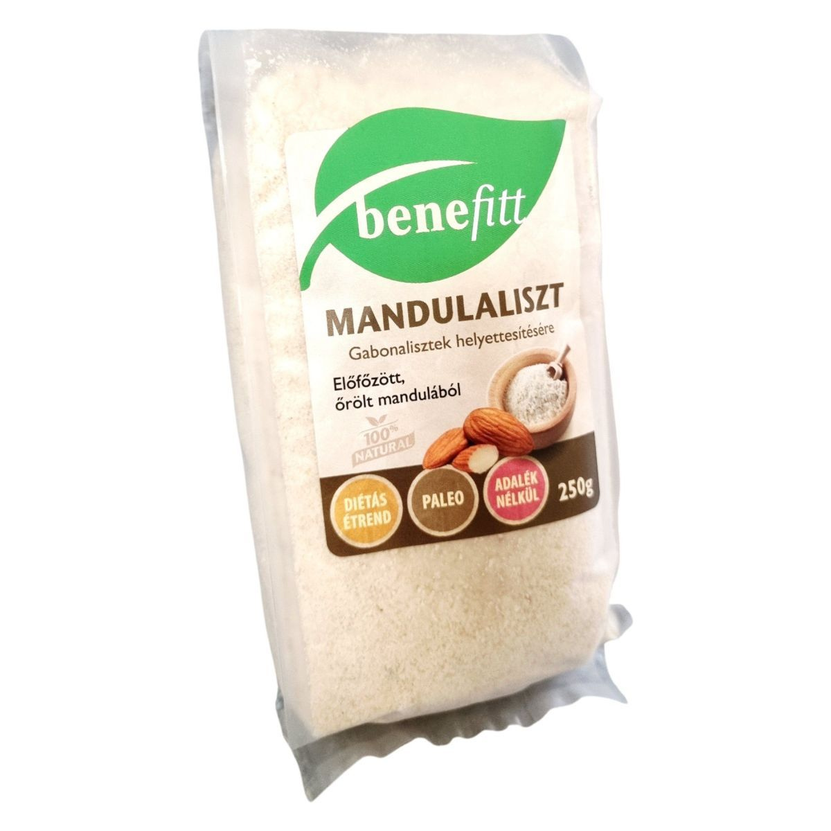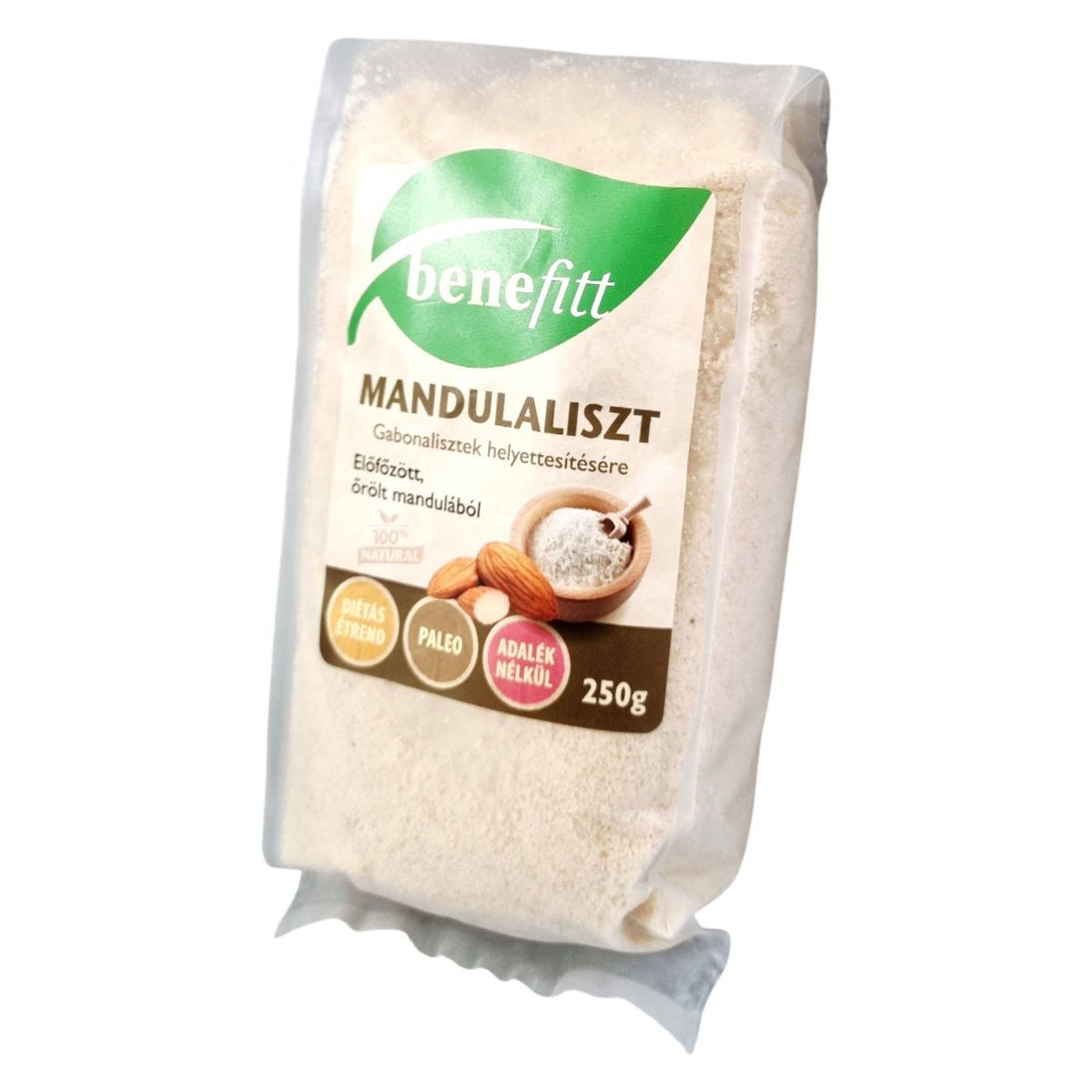 A benefitt mandulaliszt egy 100% természetes, előfőzött és őrölt mandulából készült liszthelyettesítő, amely ideális választás gluténtartalmú lisztek kiváltására. Kellemes, édes íze és alacsony glikémiás indexe miatt kedvelt az ínyencek és diétás étrendet követők körében. A termék magas zsírtartalma miatt a belőle készült tészta lágy és levegős lesz, így kiválóan alkalmas palacsinta készítésére is. A mandulaliszt gazdag kalciumban, foszforban, káliumban, E-vitaminban és folsavban, így hozzájárulhat a napi vitamin- és ásványianyag-szükséglet fedezéséhez.
