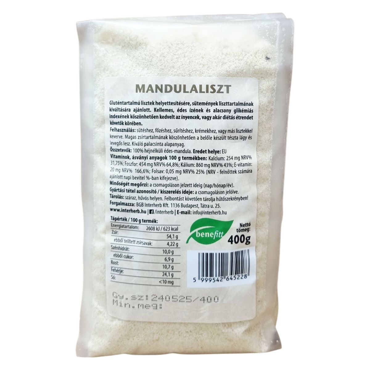 A mandulaliszt gluténtartalmú lisztek helyettesítésére készült, különösen sütemények liszttartalmának kiváltására ajánlott. Kellemes, édes íze és alacsony glikémiás indexe miatt népszerű mind ínyencek, mind diétás étrendet követők körében. Vitamin és ásványianyag tartalma jelentős, kalcium, foszfor, kálium, E-vitamin és folsav egyaránt megtalálható benne az ajánlott napi bevitel arányában. Magas zsírtartalma miatt a kész tészta puha és könnyű, így sütéshez ideális alapanyag. Eredete az EU területéről származik.