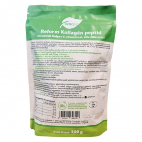 A Reform Kollagén peptid egy kellemes, frissítő ízű, instant italpor, mely kollagén peptidekben és C-vitaminban gazdag. A kollagén a bőr- és porcszerkezet nélkülözhetetlen alkotóeleme, hozzájárulhat a bőr rugalmasságának és a porcszövet épségének megőrzéséhez. A C-vitamin szerepet játszhat a megfelelő kollagénképződésben, valamint a bőr, a porc- és csontszövet normál állapotának fenntartásában. A termék közepes molekulatömegű, jól felszívódó hidrolizált kollagént tartalmaz szarvasmarha eredetű forrásból, és hozzáadott cukor vagy tartósítószerek nélkül készül. Glutén- és laktózmentes, természetes módon. A termék csomagolóanyaga 100%-ban újrahasznosítható, elősegítve a környezetvédelem támogatását.