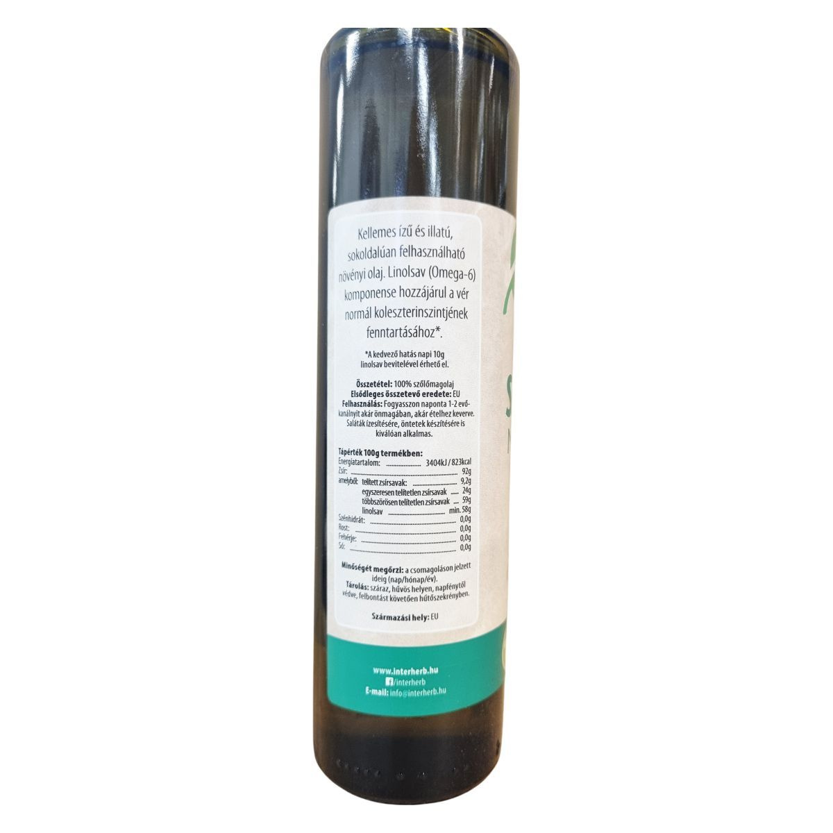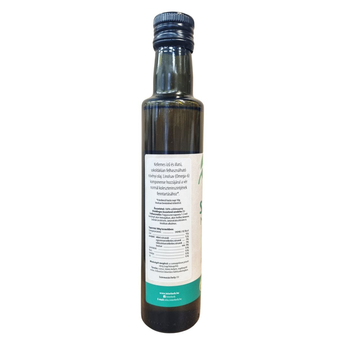 A szőlőmagolaj kellemes íz és illat mellett magas linolsavtartalommal rendelkezik, amely napi 10 g bevitel esetén támogathatja a normál koleszterinszint fenntartását. Az olaj 100%-ban szőlőmagból készül, összetevőinek eredete az Európai Unió. Sokoldalú felhasználása miatt kiváló választás a mindennapi étrendbe, akár önmagában, akár saláták vagy öntetek ízesítésére. A termék minőségét a csomagoláson megjelölt ideig megőrzi.