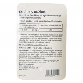 A Béres Kalcium filmtabletta egy 500 mg kalciumot tartalmazó étrend-kiegészítő készítmény, amely hozzájárulhat a normál csontozat és a fogazat fenntartásához. A termék 10 darab, egyenként 1,405 g-os filmtablettát tartalmaz, nettó tömege 14,1 g. Az adagolás felnőttek részére napi 1 tabletta. A készítmény összetevői között található kalcium-karbonát, valamint különböző tömegnövelő szerek, emulgeálószerek, csomósodást gátló anyagok, nedvesítőszer és fényezőanyag. A termék alkalmazása ellenjavallt veseelégtelenségben, vesekövességben vagy mellékpajzsmirigy túlműködés esetén. Fontos, hogy a javasolt napi adagot ne lépjék túl, és a készítményt gyermekek elől elzárva tartsák. Ez az étrend-kiegészítő nem helyettesíti a változatos, kiegyensúlyozott étrendet és az egészséges életmódot.