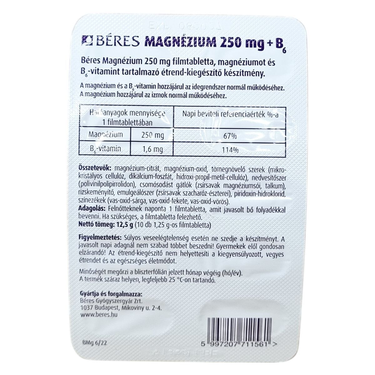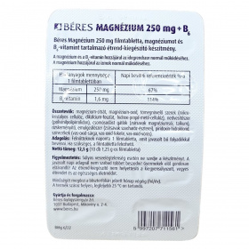 A Béres Magnézium 250 mg + B6 étrend-kiegészítő filmtabletta magnézium- és B6-vitamin-tartalma révén hozzájárulhat az idegrendszer és az izmok normál működéséhez. A termék 10 darab, egyenként 1,25 gramm tömegű filmtablettát tartalmaz, és magnézium-citrátot valamint magnézium-oxidot, továbbá különféle tömegnövelő, nedvesítő, csomósodást gátló és emulgeáló anyagokat, valamint piridoxin-hidrokloridot és vas-oxid színezékeket foglal magában. A napi ajánlott adag felnőttek számára 1 filmtabletta, amit bő folyadékkal javasolt bevenni; szükség esetén a filmtabletta felezhető. A készítményt súlyos veseelégtelenség esetén nem szabad alkalmazni, és gyermekek elől elzárva kell tartani. A termék nem helyettesíti a kiegyensúlyozott, változatos étrendet és az egészséges életmódot.