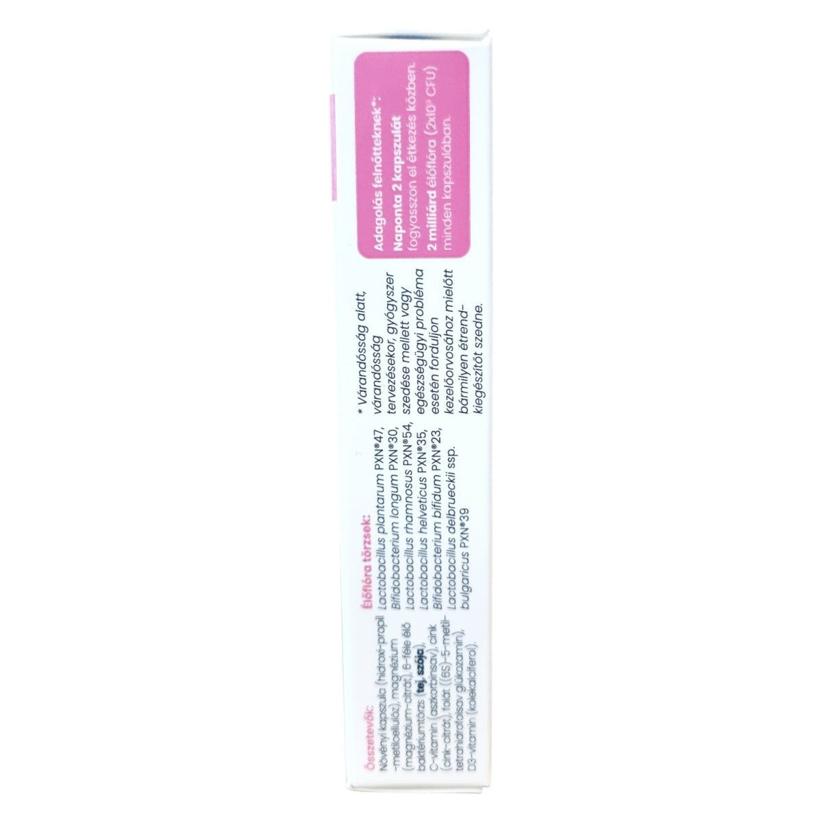 Mikrokapszulás (hidroxi-propil-metil-cellulóz), magnézium-oxid, cink-oxid, kalcium-L-metil-folát, aszkorbinsav (C-vitamin), kolekalciferol (D3-vitamin), élőflóra kultúrák: Lactobacillus plantarum PXN®47, Lactobacillus longum PXN®30, Bifidobacterium breve PXN®25, Bifidobacterium longum PXN®33, Lactobacillus helveticus PXN®35, Lactobacillus delbrueckii ssp. bulgaricus PXN®39.