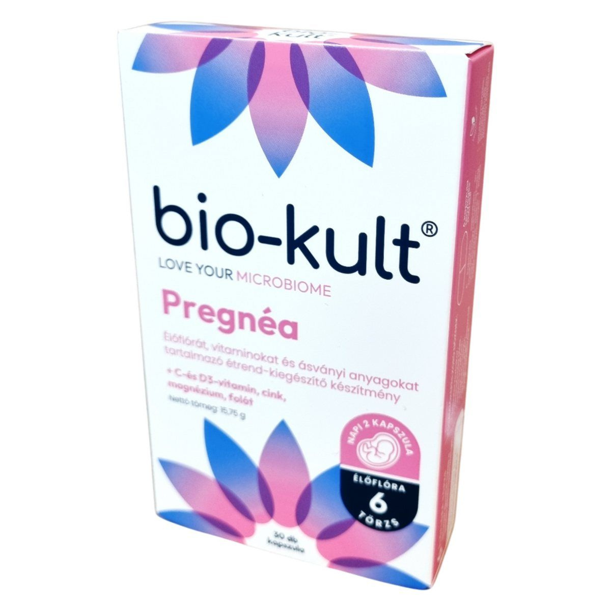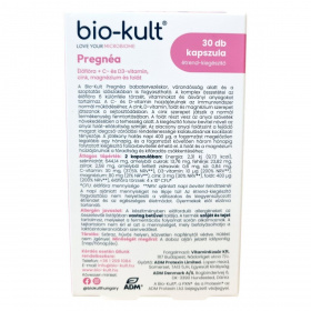 A Bio-Kult Pregnea egy fejlett, komplex formula, amely a várandósság különböző szakaszaiban is biztonságosan fogyasztható. A termék 6 élőflóra törzset tartalmaz, amelyek támogatják a bélflóra természetes egyensúlyát, ezzel segítve az immunrendszer működését és az emésztés megfelelő állapotát. A C- és D3-vitamin hozzájárulhat az immunrendszer normál működéséhez, míg a cink a sejtosztódásban és a normál termékenység fenntartásában játszhat szerepet. A folát támogatja az anyai szövetek növekedését a terhesség alatt, és hozzájárulhat a magzati idegcső-záródási rendellenességek kockázatának csökkentéséhez. A készítmény napi 400 µg folátot biztosít, ami megfelel az ajánlott napi mennyiségnek. A 30 db-os kiszerelés 15 napos kúrára elegendő. A formula teljesen gluténmentes, vegán kapszulában kerül forgalomba, mesterséges adalékanyagok nélkül. A termék tudományosan fejlesztett élőflóra-törzseket tartalmaz (4 × 10⁹ CFU), melyek segíthetik a mikrobiom egészséges egyensúlyát és a szervezet természetes védekezőképességét a várandósság időszakában.