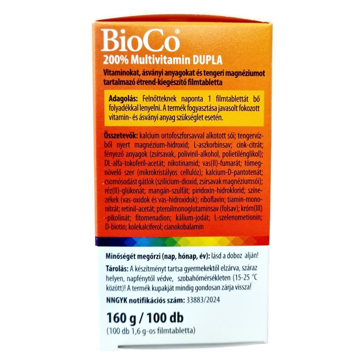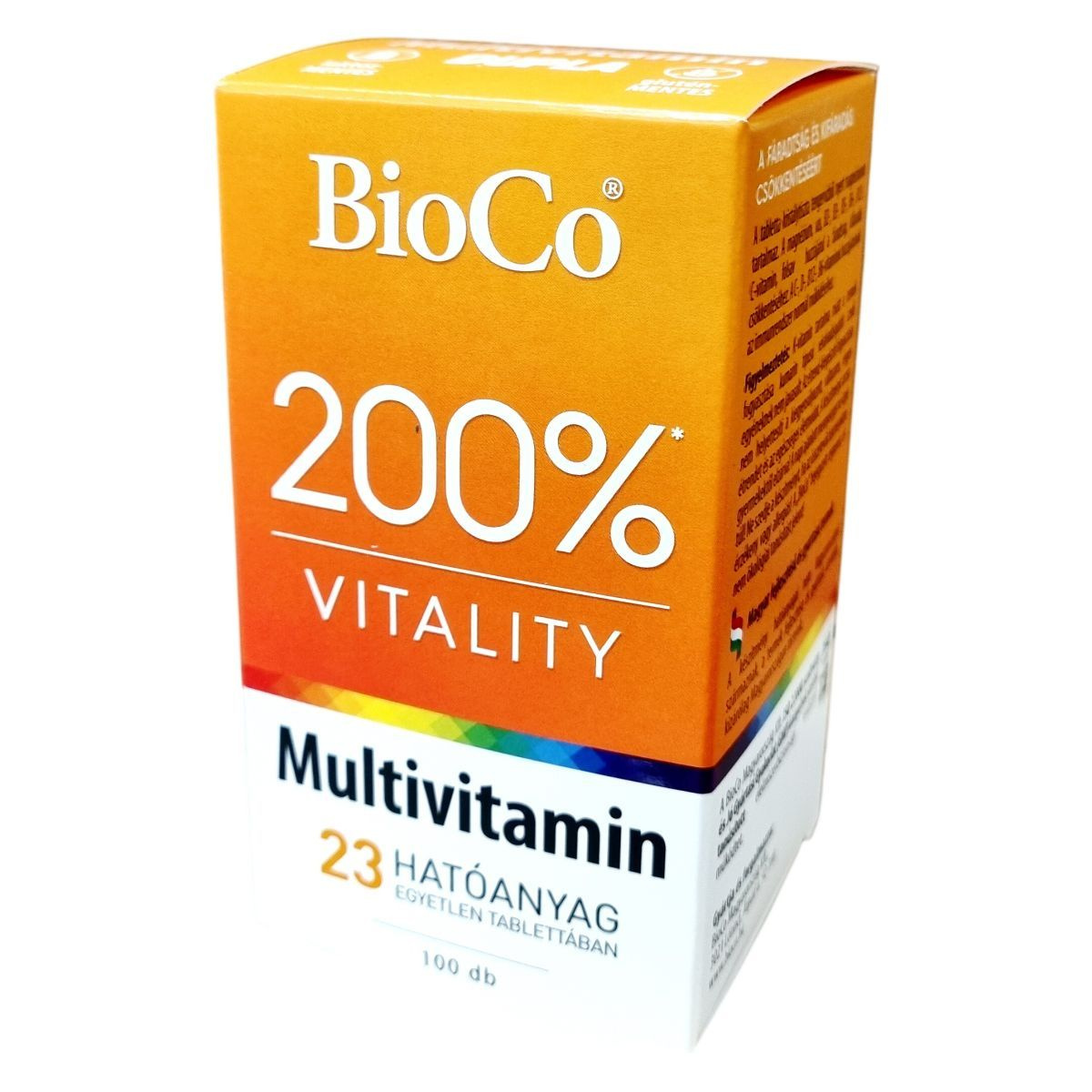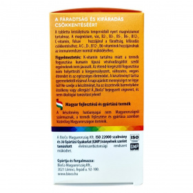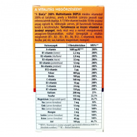 A BioCo 200% Multivitamin DUPLA egy magyar fejlesztésű és gyártású étrend-kiegészítő, mely 23 féle hatóanyagot tartalmaz egyetlen tablettában. A készítmény összetevői között megtalálhatók a fontos vitaminok és ásványi anyagok, melyek közül a legtöbb szerves formában, jól hasznosuló változatban került be a tablettába. A termék támogatni tudja a fáradtság és kifáradás csökkentését, valamint az immunrendszer normál működését. A készítményben kristálytiszta tengervízből származó magnézium is található. A BioCo Magyarország Kft. által gyártott termék megfelel az ISO 22000 szabványnak és a Jó Gyártási Gyakorlat előírásainak, amely garantálja a minőséget és biztonságot. A termék fogyasztása javasolt fokozott vitamin- és ásványianyag-szükséglet esetén, azonban nem helyettesíti a kiegyensúlyozott, változatos étrendet és az egészséges életmódot.