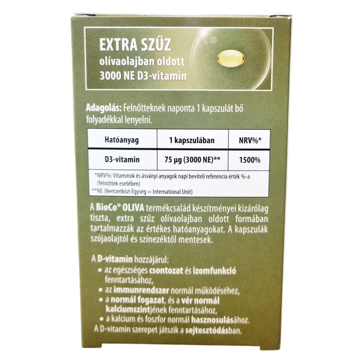 A BioCo® OLIVA termékcsalád készítményei kizárólag tiszta, extra szűz olívaolajban oldott formában tartalmazzák az értékes hatóanyagokat. A D3-vitamin hozzájárulhat az egészséges csontozat és izomfunkció fenntartásához, az immunrendszer normál működéséhez, a normál fogazat és a vér normál kalciumszintjének fenntartásához, valamint a kalcium és foszfor normál hasznosulásához. Ezen túlmenően a D-vitamin szerepet játszhat a sejtosztódásban. A kapszulák szójaolajtól és színezékektől mentesek, így számos étrendi igényhez alkalmazkodnak.