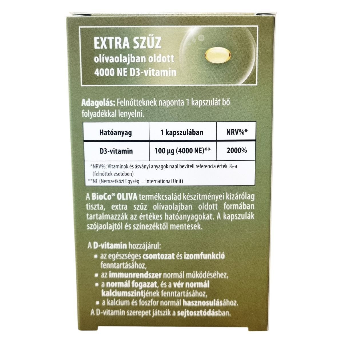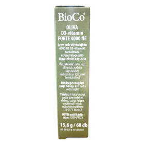 A BioCo OLIVA D3-vitamin FORTE 4000 NE egy extra szűz olivaolajban oldott, magas dózisú D3-vitamin étrend-kiegészítő kapszula, amely kizárólag természetes összetevőket tartalmaz.