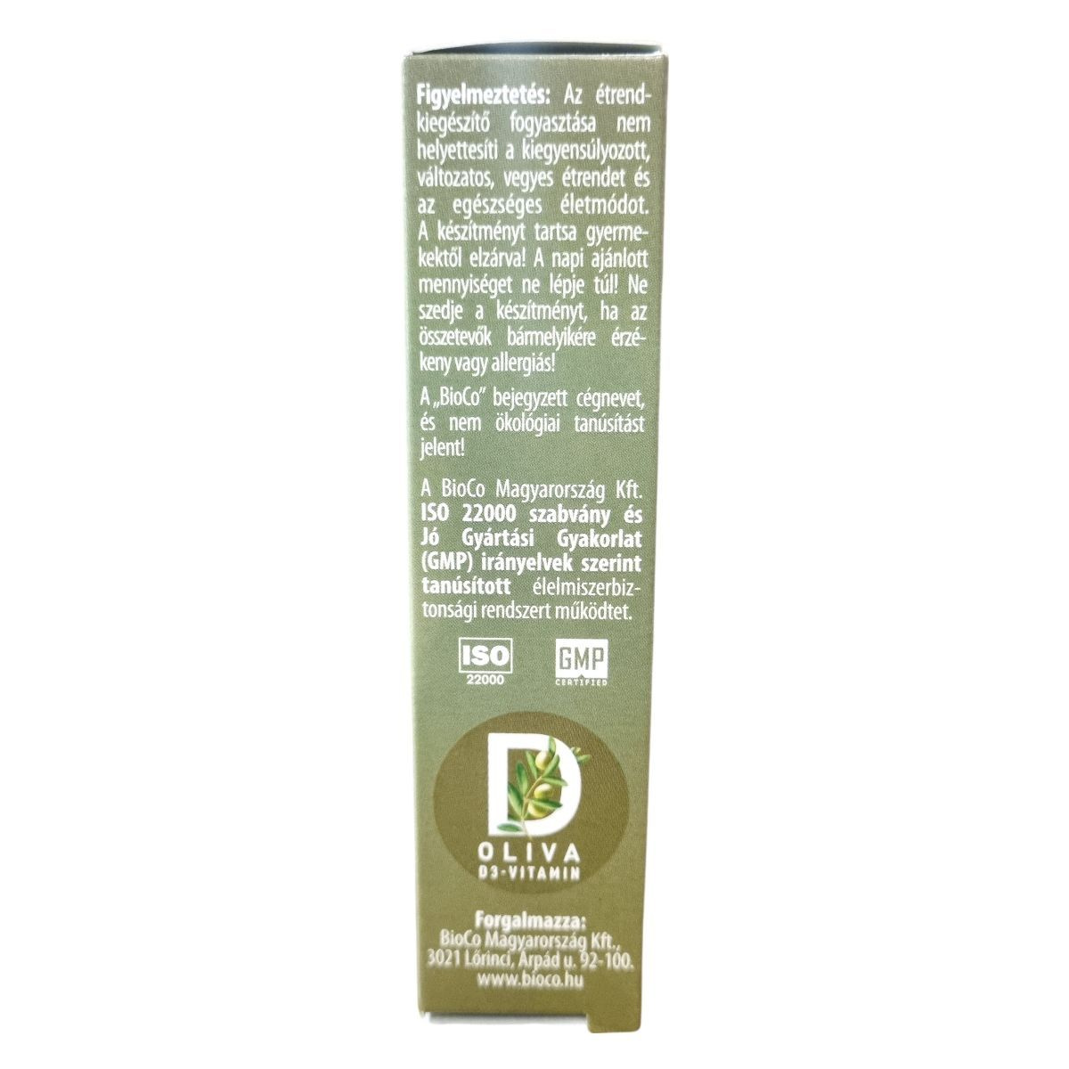 A BioCo OLIVA D3-vitamin FORTE 4000 NE kapszulák kizárólag tiszta, extra szűz olivaolajban oldott D3-vitamint tartalmaznak, így biztosítva a hatóanyagok jó felszívódását. A kapszulák szójaolajtól és színezéktől mentesek, ezáltal megfelelnek a speciális táplálkozási igényeknek. A D-vitamin hozzájárulhat az egészséges csontozat és izomfunkció fenntartásához, az immunrendszer normál működéséhez, a normál fogazathoz és vér kalciumszintjének fenntartásához, továbbá a kalcium és foszfor normál hasznosulásához. A D-vitamin szerepet játszhat a sejtosztódás folyamatában. A termék a BioCo Magyarország Kft. által, ISO 22000 szabvány és Jó Gyártási Gyakorlat (GMP) irányelvek szerint működtetett élelmiszerbiztonsági rendszerben készül.